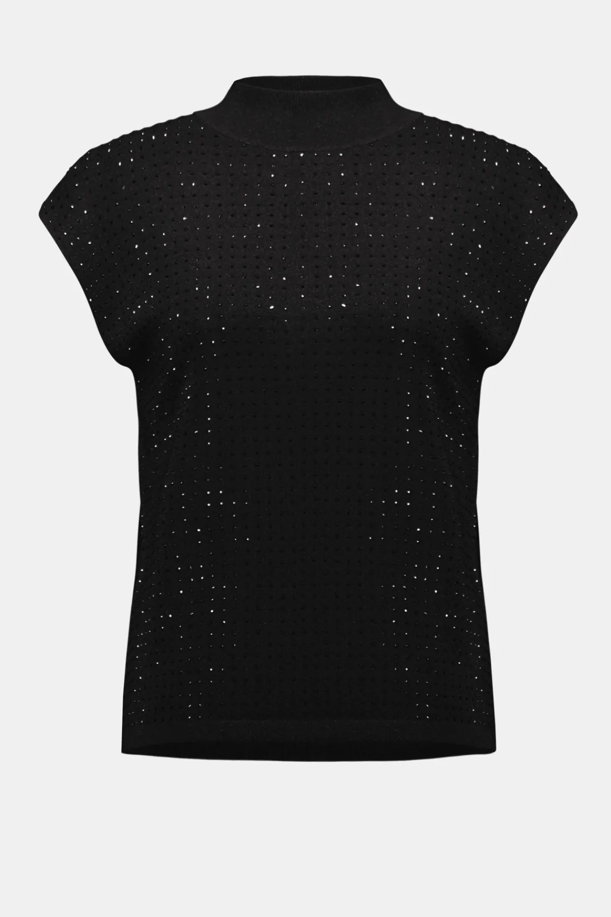 This versatile sleeveless pullover is a chic addition to your occasion wardrobe, featuring a sophisticated mock neck and elegant iron-on detailing. Crafted from a soft sweater knit in a flattering straight fit, it pairs beautifully with a variety of bottoms for a polished look.