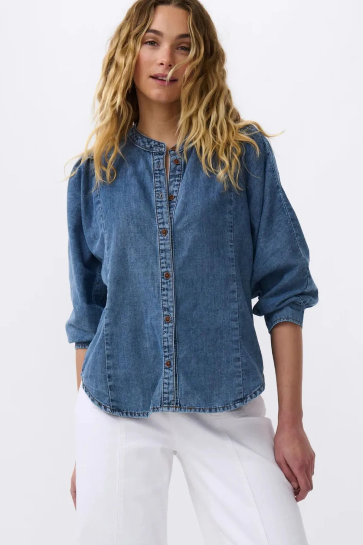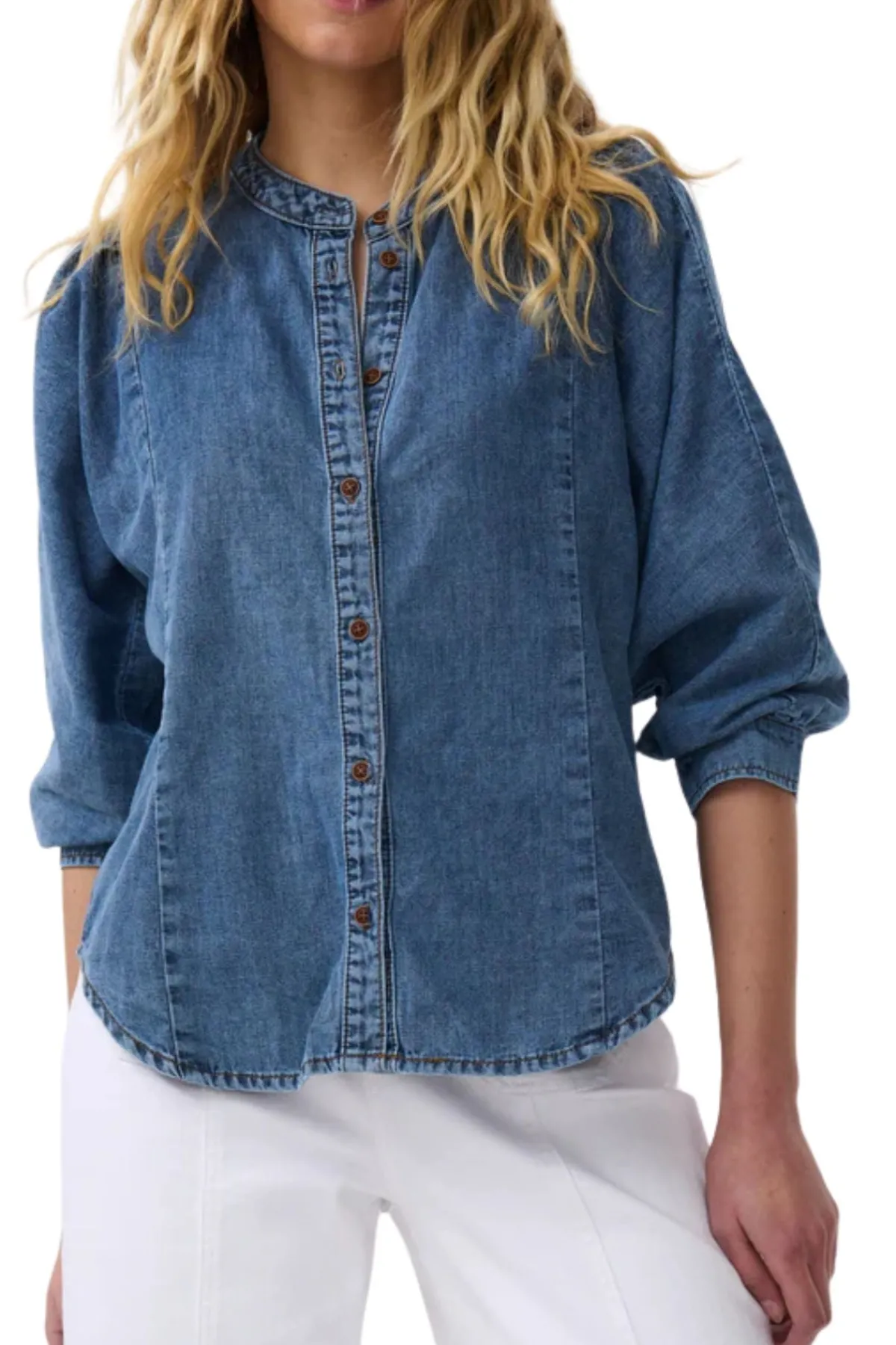 The shirt so comfortable you’ll be hard pressed not to wear it every day. Isla Shirt features a structured silhouette, puffed shoulder and 3/4 sleeves in Baja Blue wash cotton chambray.