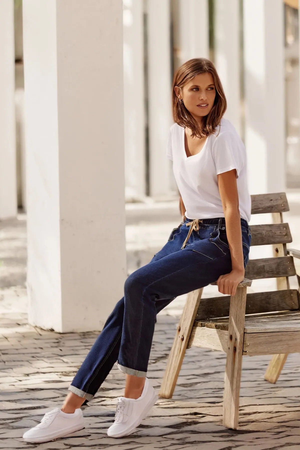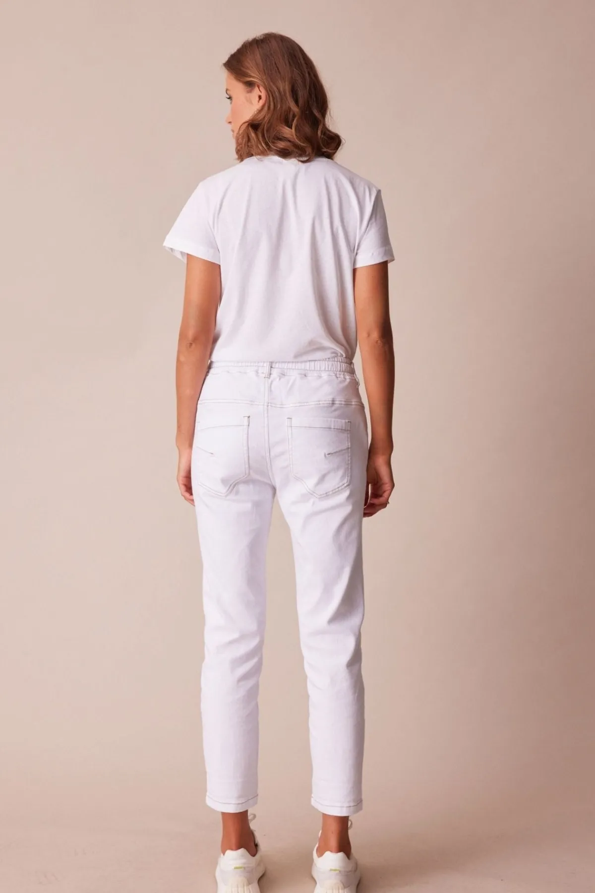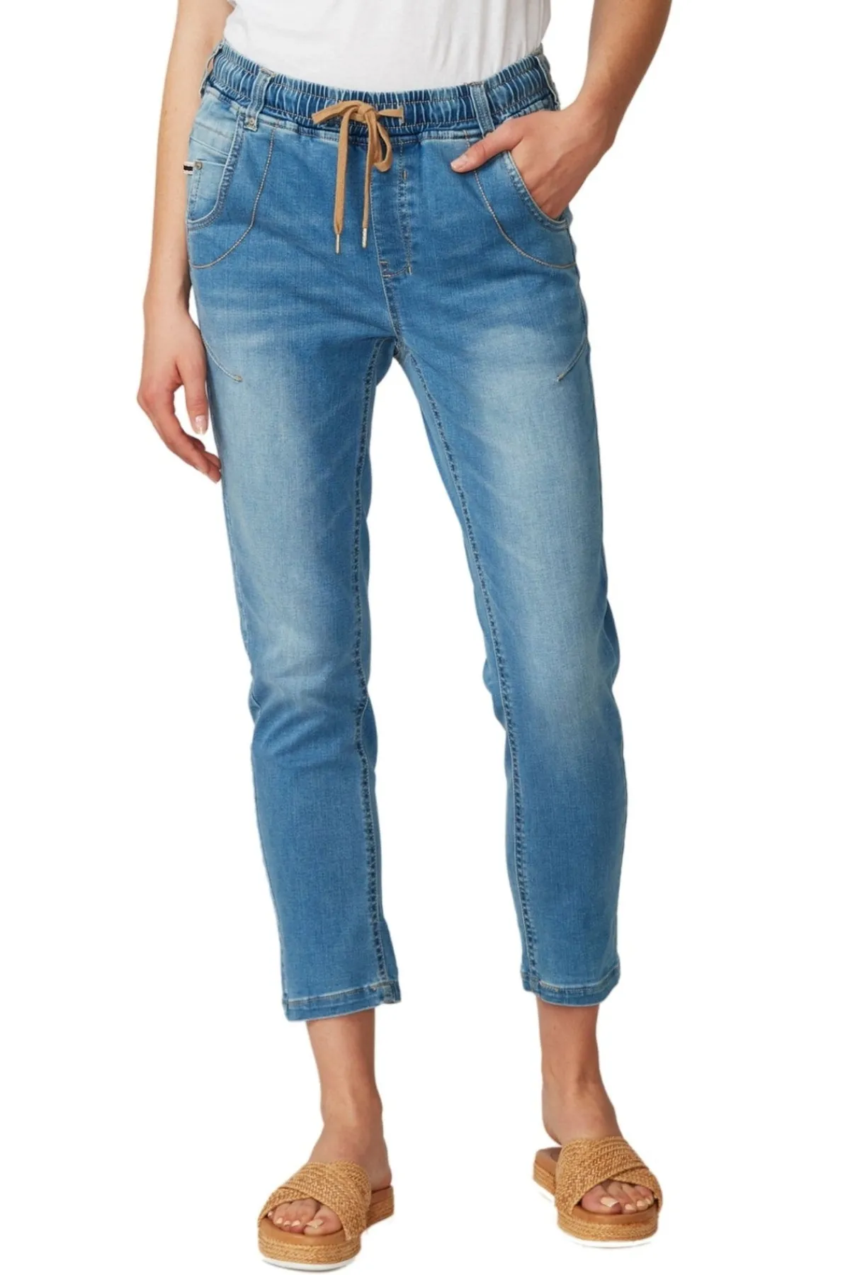 Casual jean with elasticated waist and adjustable drawstring tie. Soft handle distressed and new indigo colour achieved by special garment wash.