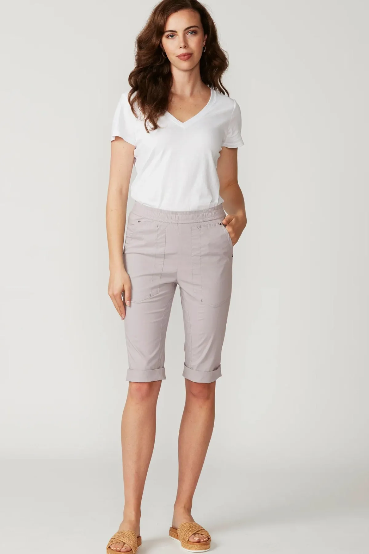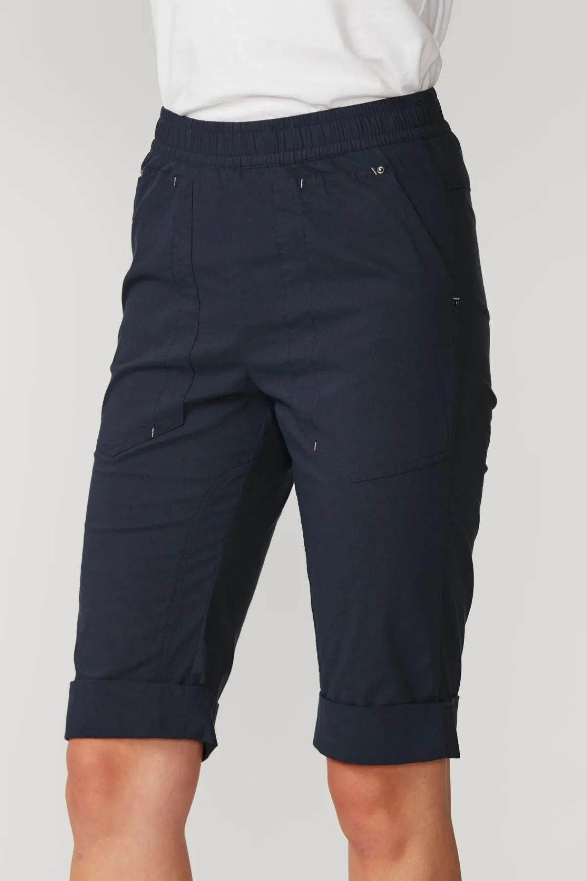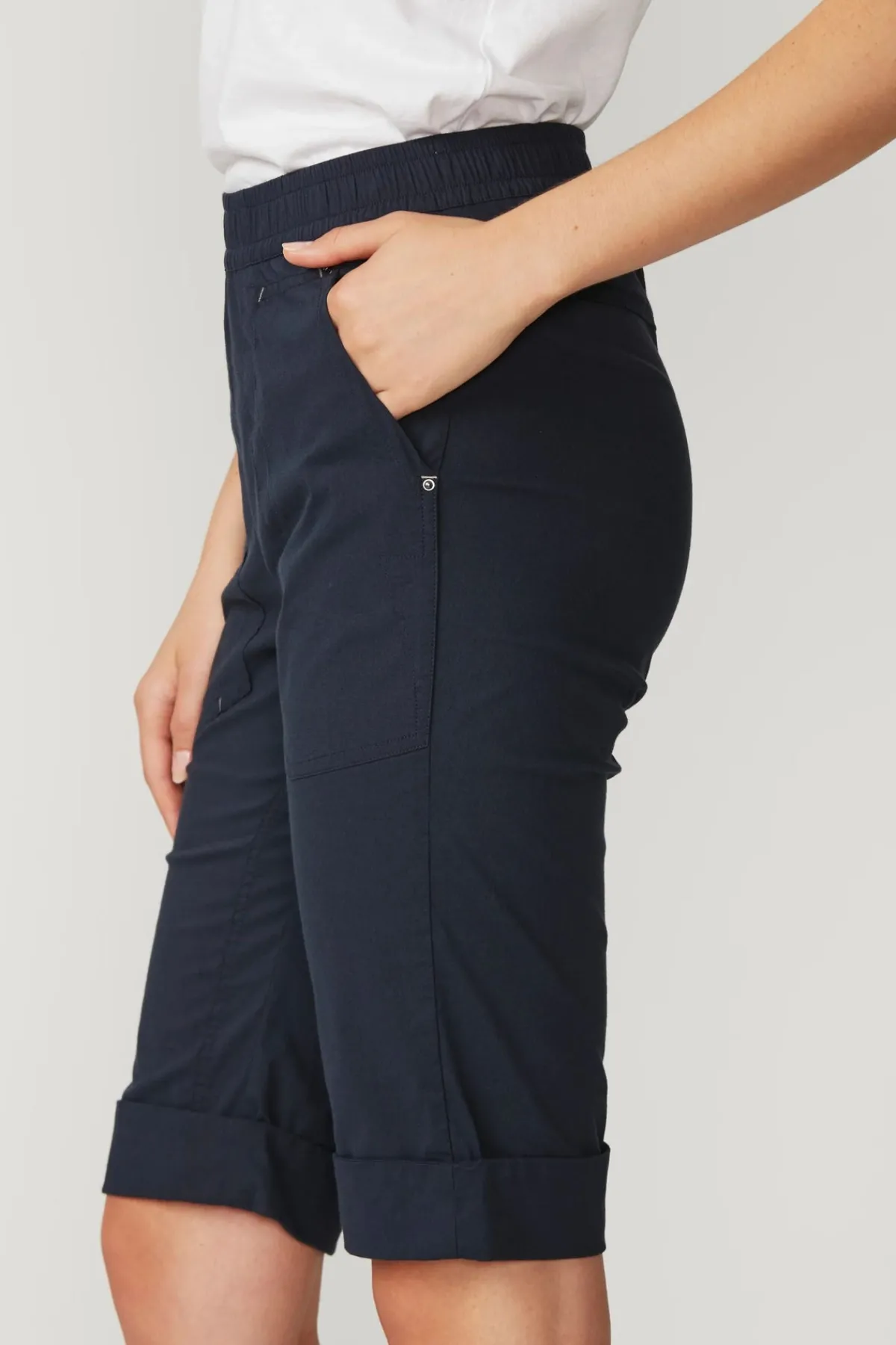Relaxed knee length short with optional turn up cuff, features elasticated waist in lightweight cotton rich stretch fabric.