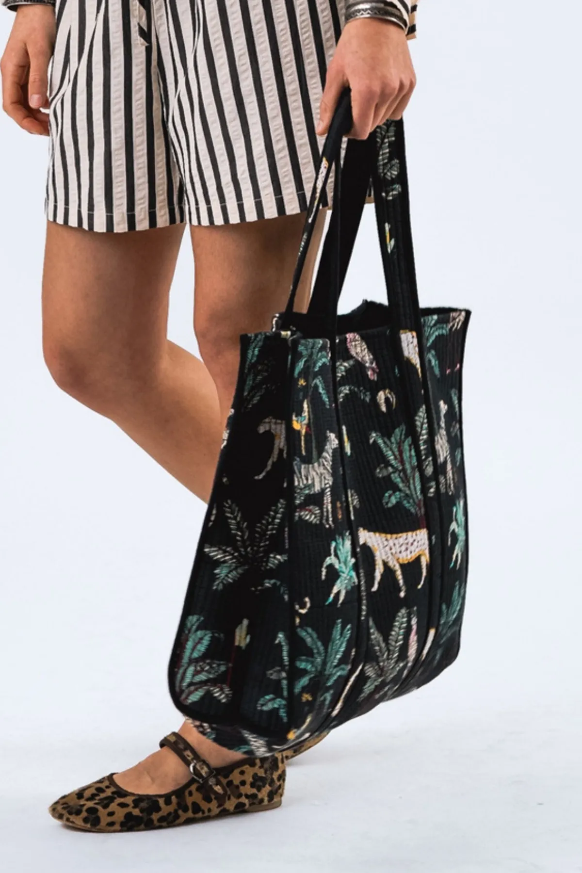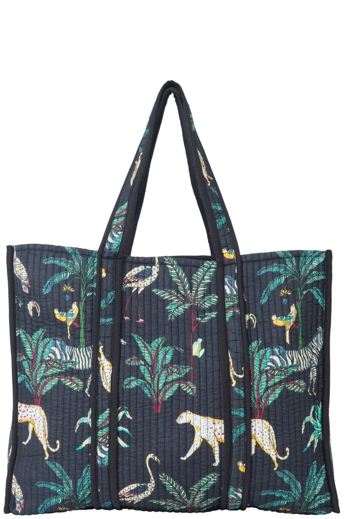 The ZelkovaLL bag is made from quilted fabric with a unique, colourful print depicting tropical palms, elegant birds, and majestic animals like leopards and zebras. The vibrant and colourful pattern stands out beautifully against the washed black background with black piping, making the bag a true statement piece. With its spacious size, it’s ideal for everything from beach trips to a day in the city when you need extra room. It features wide, comfortable straps, and the durable material ensures that the bag withstands daily use. The ZelkovaLL bag offers you a practical bag that doesn’t compromise on style.