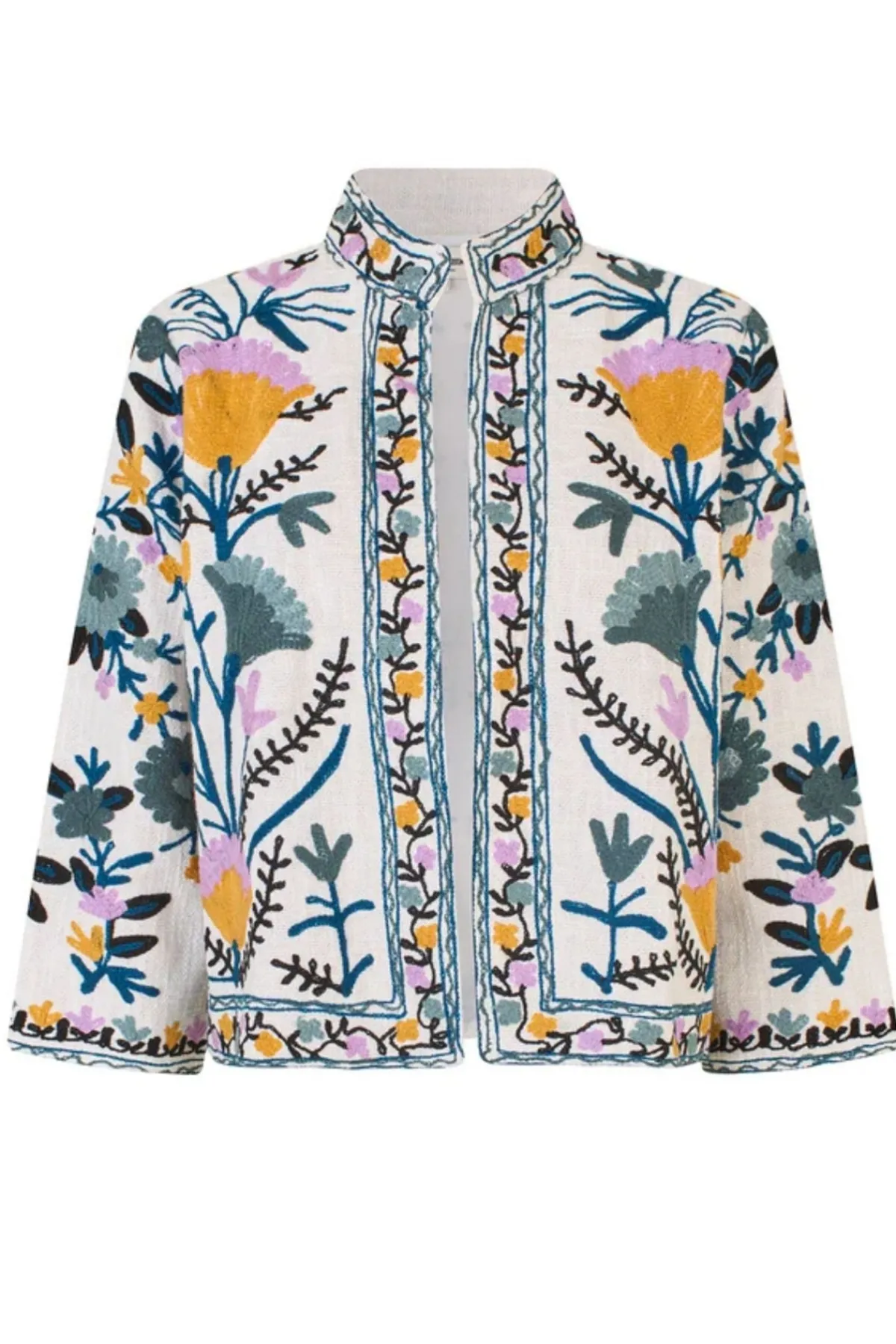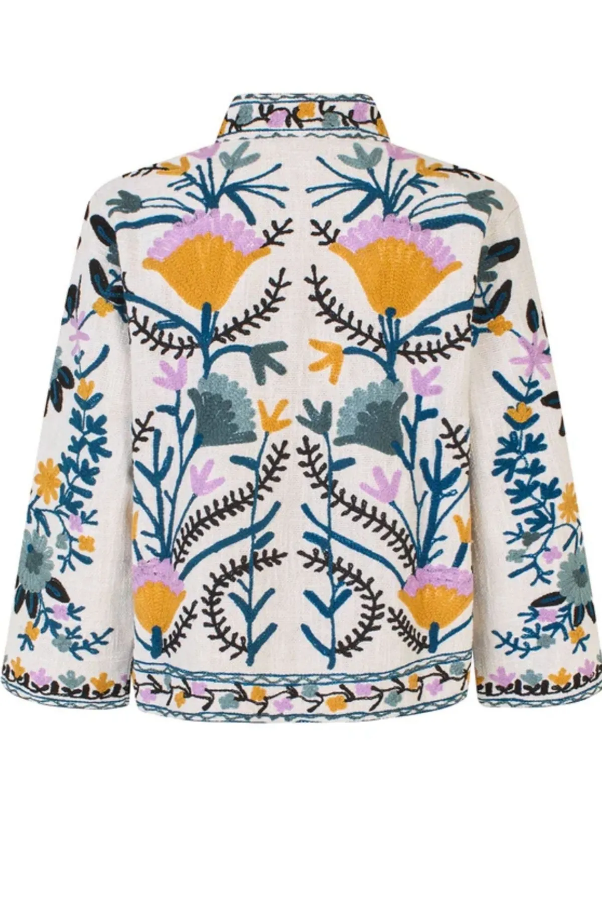 The SadieLL jacket is the perfect blend of bohemian charm and elegance. Featuring stunning floral embroidery, it adds a unique touch to any wardrobe. Made from 100% cotton for both comfort and style – ideal for the season’s many occasions.