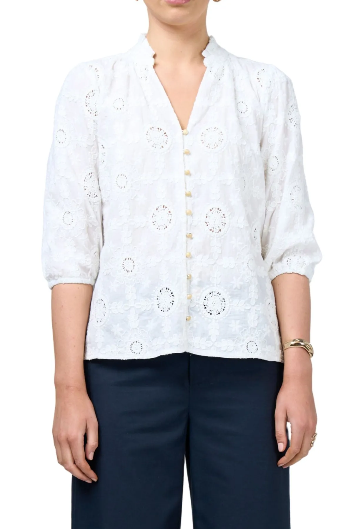 - Crochet cotton, button-through blouse with metal buttons and a delicate ruffled neckline, with blousons sleeves and elasticated cuffs.