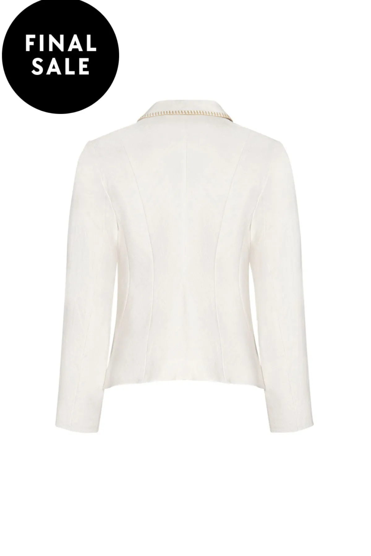 Fitted blazer in a subtle herringbone texture, featuring hand embroidered edging and shaped into a curved hem that softly flutes at the back.