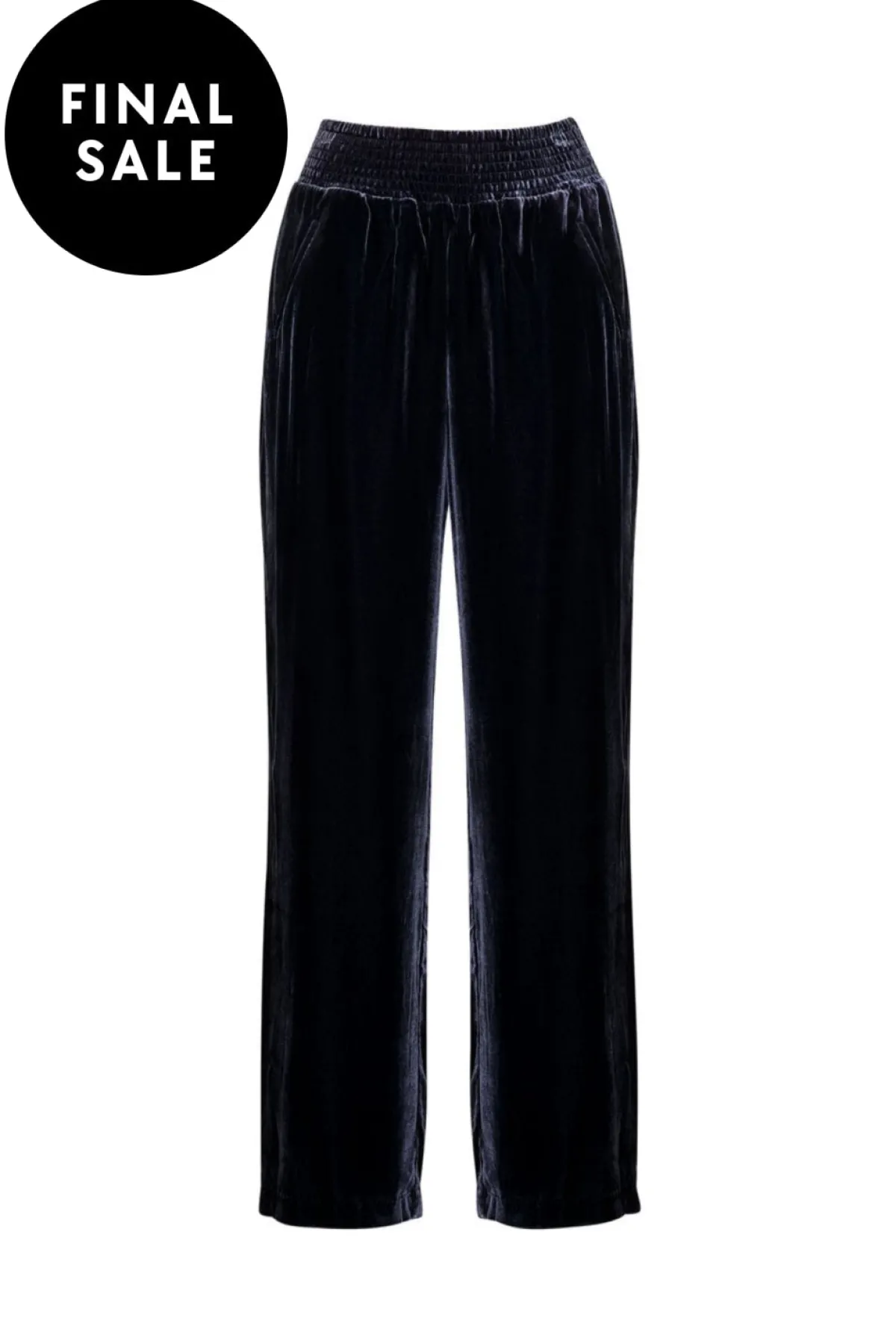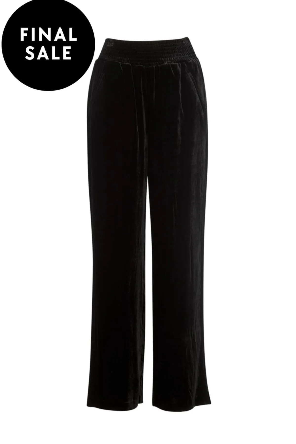 Palazzo style pant in a luxe silk blend velvet with a shirred waistband, and functional pockets.