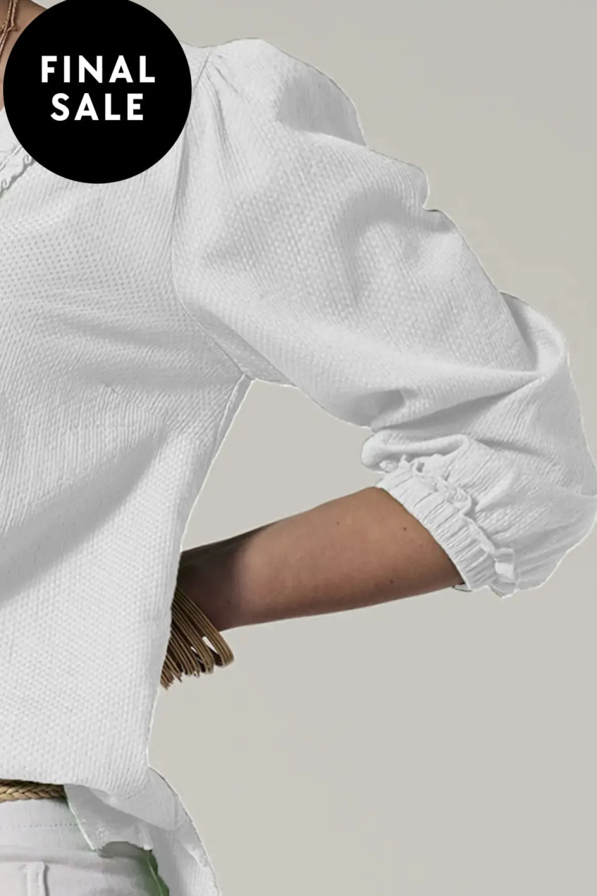Textured long sleeve top with a ruffle V-neckline with ruched ruffles down front body and at the sleeve opening.