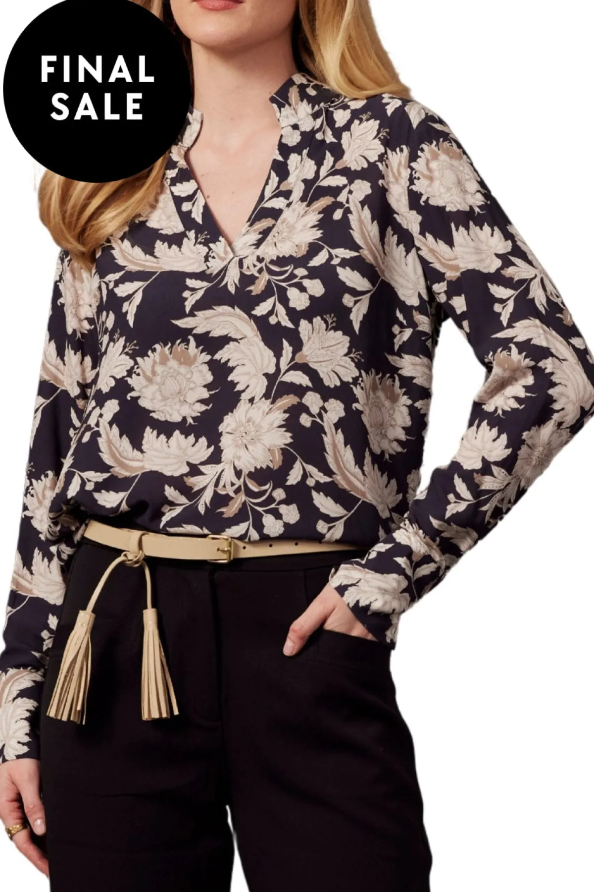 Relaxed fit blouse with a V-neckine and upstanding back collar. Deep cuffs with self-covered buttons. Hemline dips at the back.