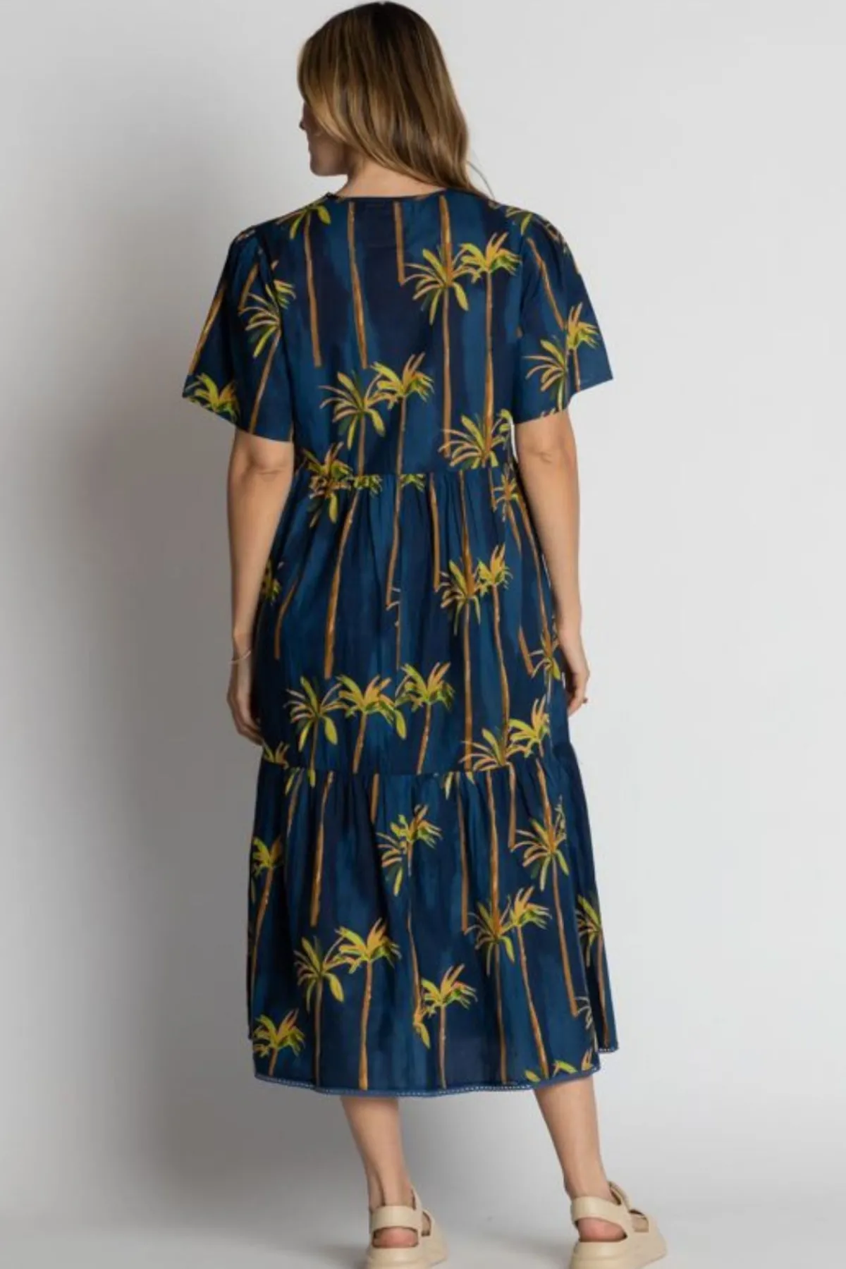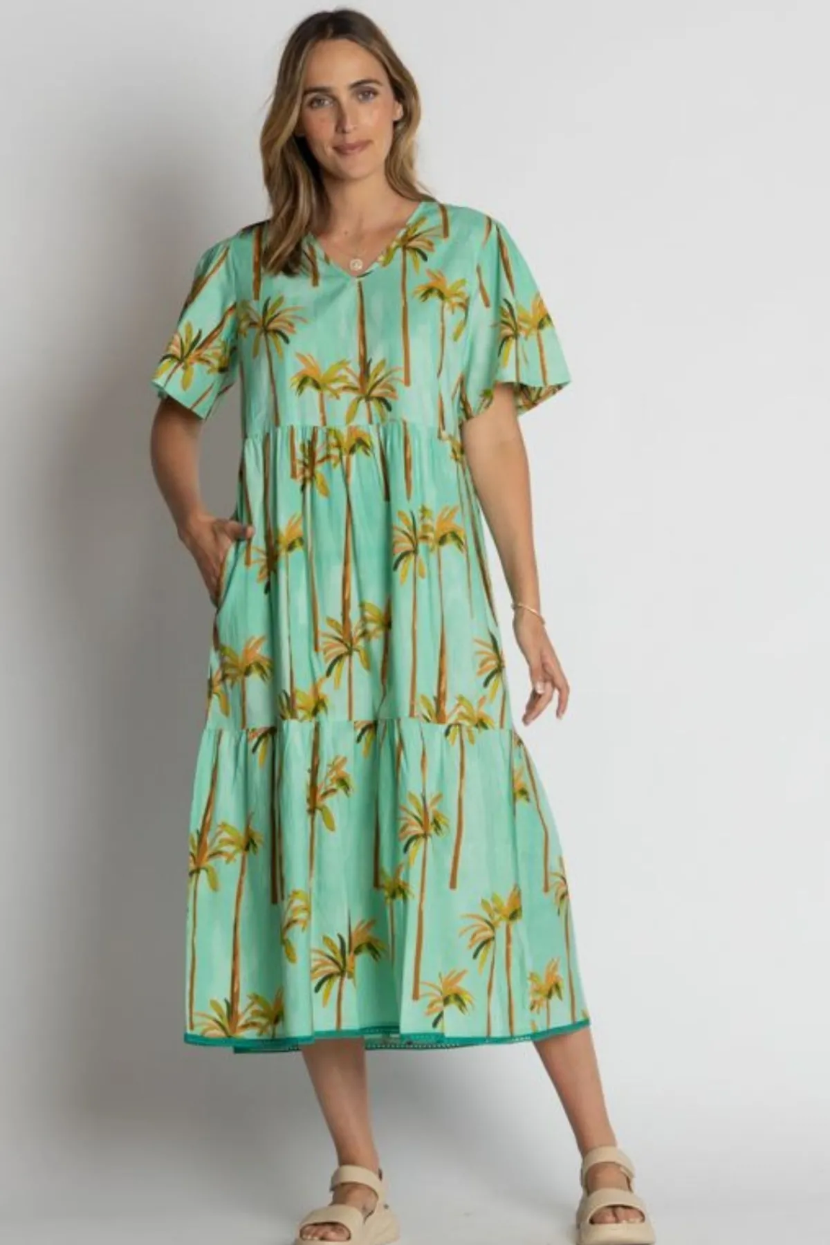 The Lula Life Badira Midi Dress is the perfect mix of comfort and tropical charm. Designed in Australia and made from 100% cotton, this below-calf length dress features a relaxed fit with elbow-length sleeves and practical side pockets. Tiered gathers create soft movement, while the braid trim on the hem adds a stylish finish. Showcasing a vibrant tropical palm tree digital print, this lightweight cotton midi dress is ideal for summer holidays, beach escapes, or relaxed everyday wear.