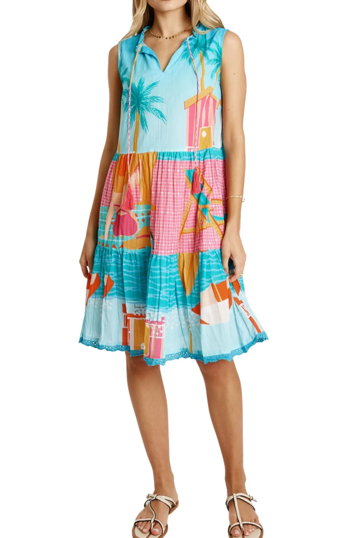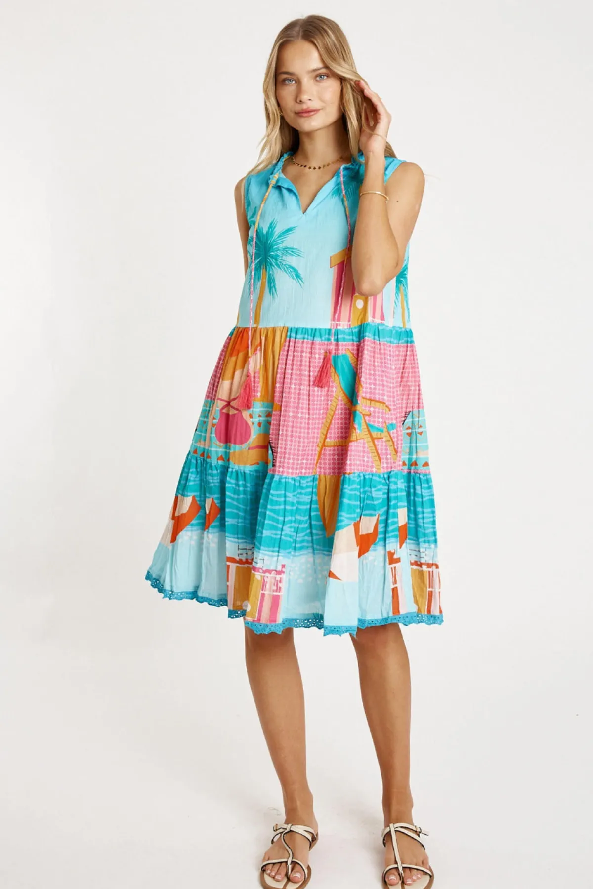 Bright, breezy, and beautifully detailed, the Lula Life Seraphina S/L Dress is the perfect warm-weather go-to. Made from 100% cotton voile, it feels feather-light, breathable, and effortlessly comfortable. The adjustable neckline with tie and tassels adds a playful touch, while the tiered and gathered design gives the dress soft movement and relaxed charm. Practical side pockets, a flattering knee-length cut, and delicate lace hem edging complete the look. Finished in a vibrant digital print and proudly designed in Australia, this sleeveless dress is ideal for sunny days, holidays, and easy weekend style.