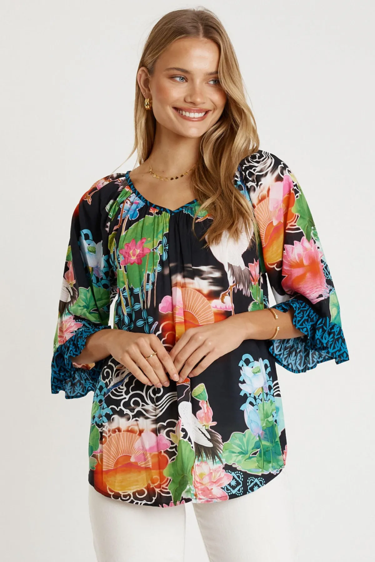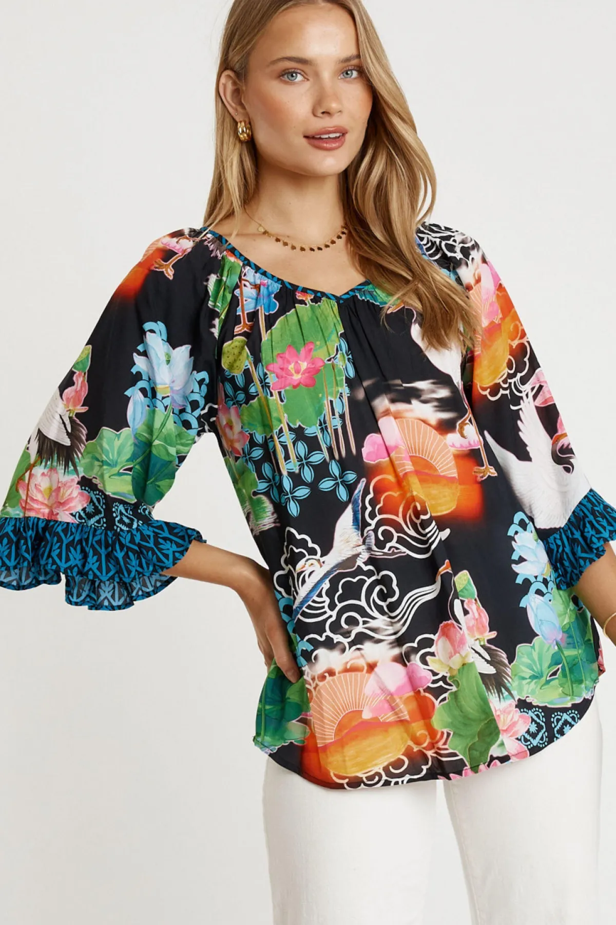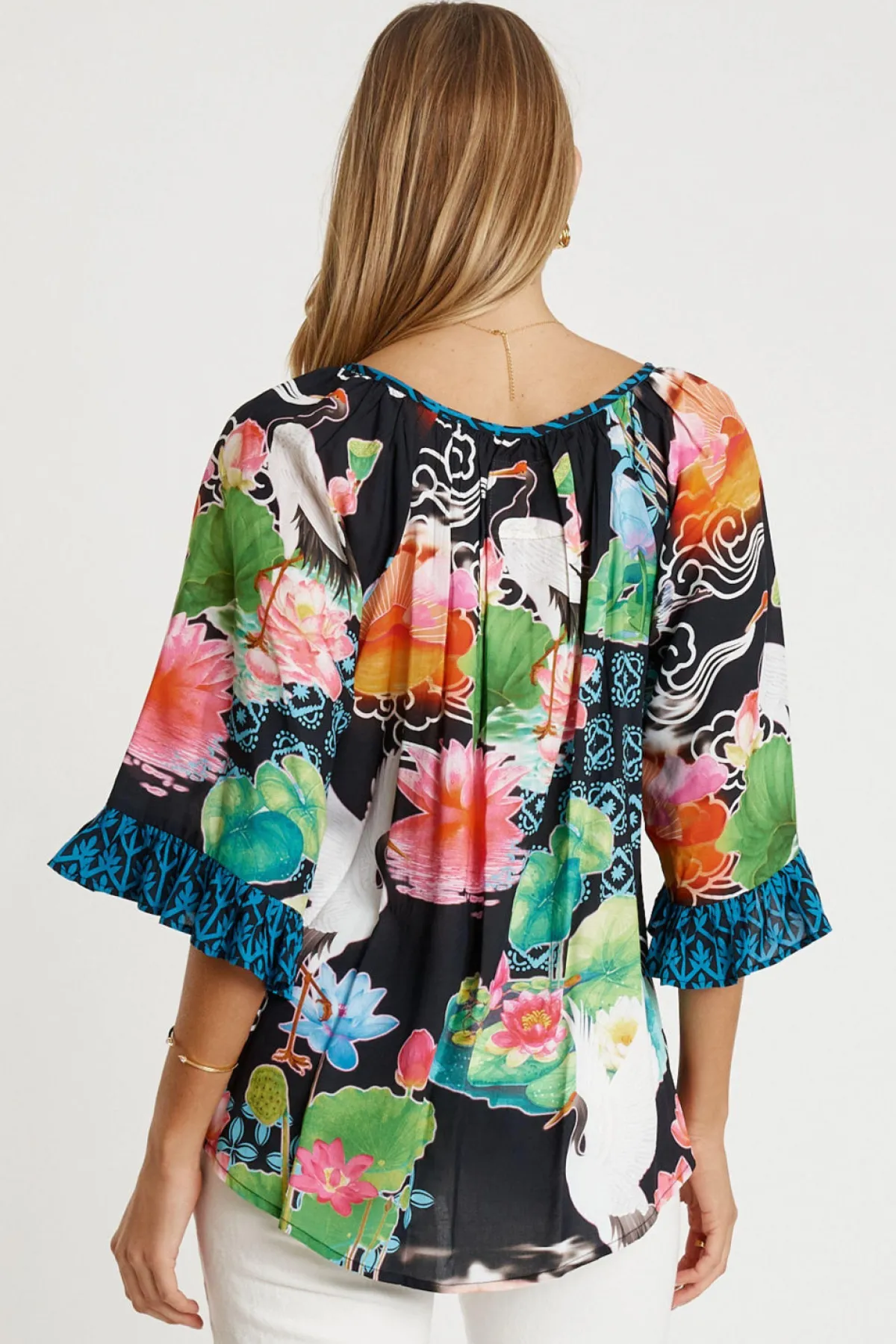 Blending comfort with standout detail, the Lula Life Akiko Top brings easy, everyday style with a touch of charm. Made from 100% viscose, this relaxed top feels soft and lightweight, perfect for warm days or laid-back outings. The V-neckline, gentle gathers, and wide raglan sleeves with a flounce hem give it a flowy, feminine look. Finished with a curved hem and a Japanese-inspired digital print, this Australian-designed piece pairs effortlessly with denim, linen, or your favourite summer pants for a bold yet easy vibe.