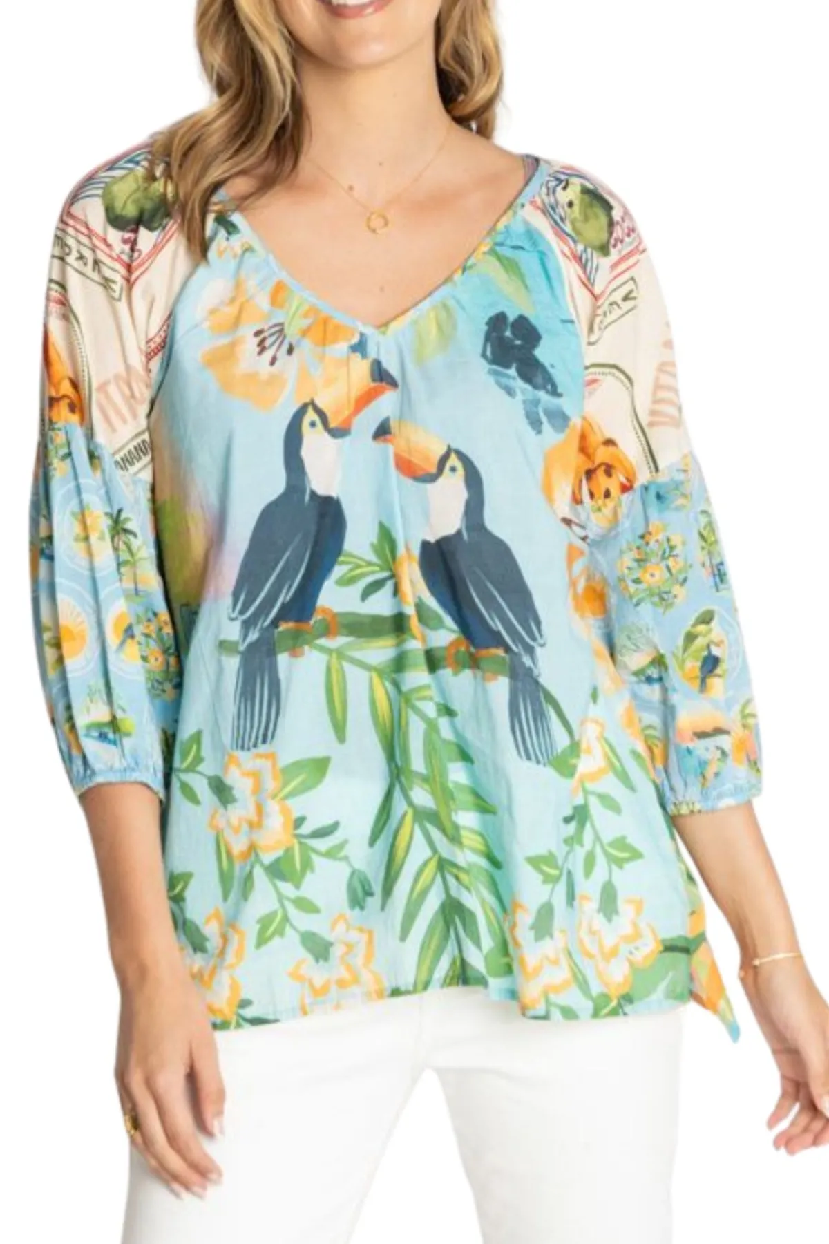 The EXOTICA TOP combines a playful toucan print with a relaxed tunic silhouette, perfect for summer gatherings. Its breezy fit ensures comfort while the vibrant design adds a touch of elegance to your party wardrobe. Ideal for effortless style with a sophisticated edge.