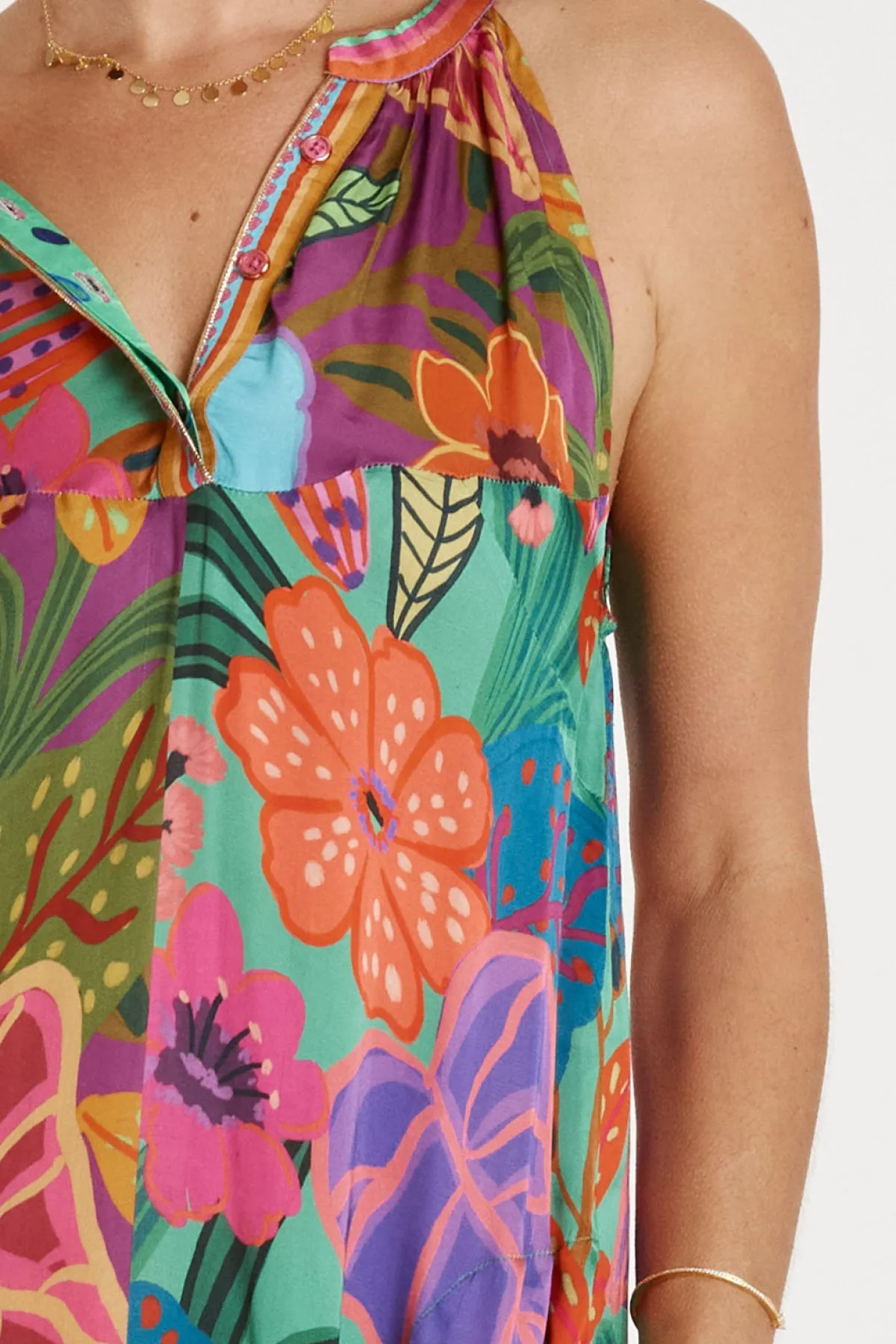 The Lula Soul Auberge Maxi Dress is a relaxed and versatile summer essential, designed in Australia and crafted from lightweight a viscose modal mix. Showcasing a vibrant tropical digital print, this maxi dress features an easy A-line shape for comfort and style. Side pockets add everyday practicality, while the curved hem creates a flattering silhouette. Finished with a decorative trim for a playful touch. Perfect for beach holidays, summer events, or relaxed weekends.