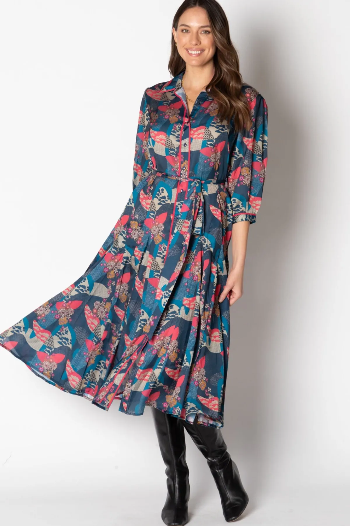 Indulge in the luxury of the Cadiz Midi shirt dress by Lula Soul. Elevate your style with the 3/4 sleeves, full gored skirt, and moonlight floral print. The cerise trim on the front opening and cuffs adds a touch of sophistication. Perfect for dancing the night away with elegance and grace.