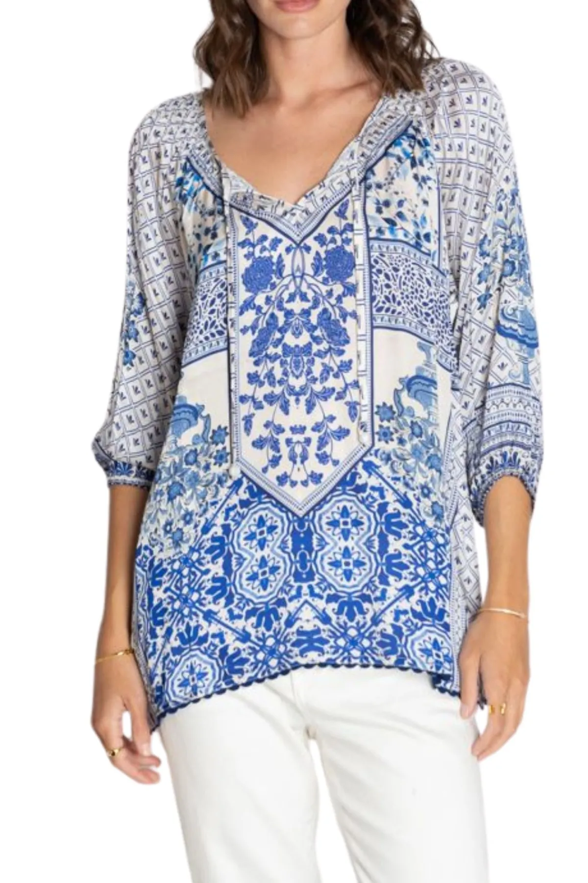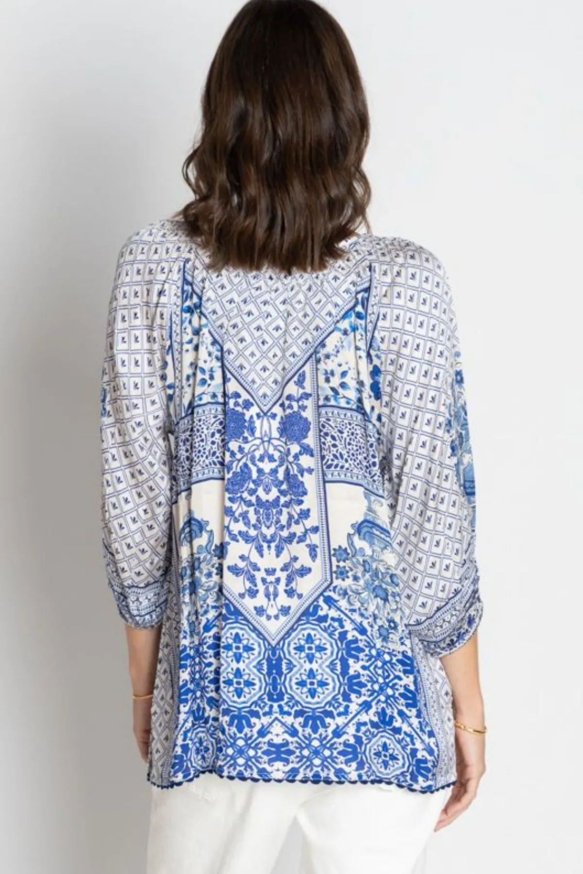 Crafted from luxuriously soft 100% satin modal, this relaxed-fit shirt features a flattering V-neckline with delicate gathers, wide raglan sleeves finished with ruffle hems, and intricate ladder lace trim.Perfect for pairing with jeans, skirts, or tailored pants, this shirt blends comfort, style, and timeless appeal for any occasion.