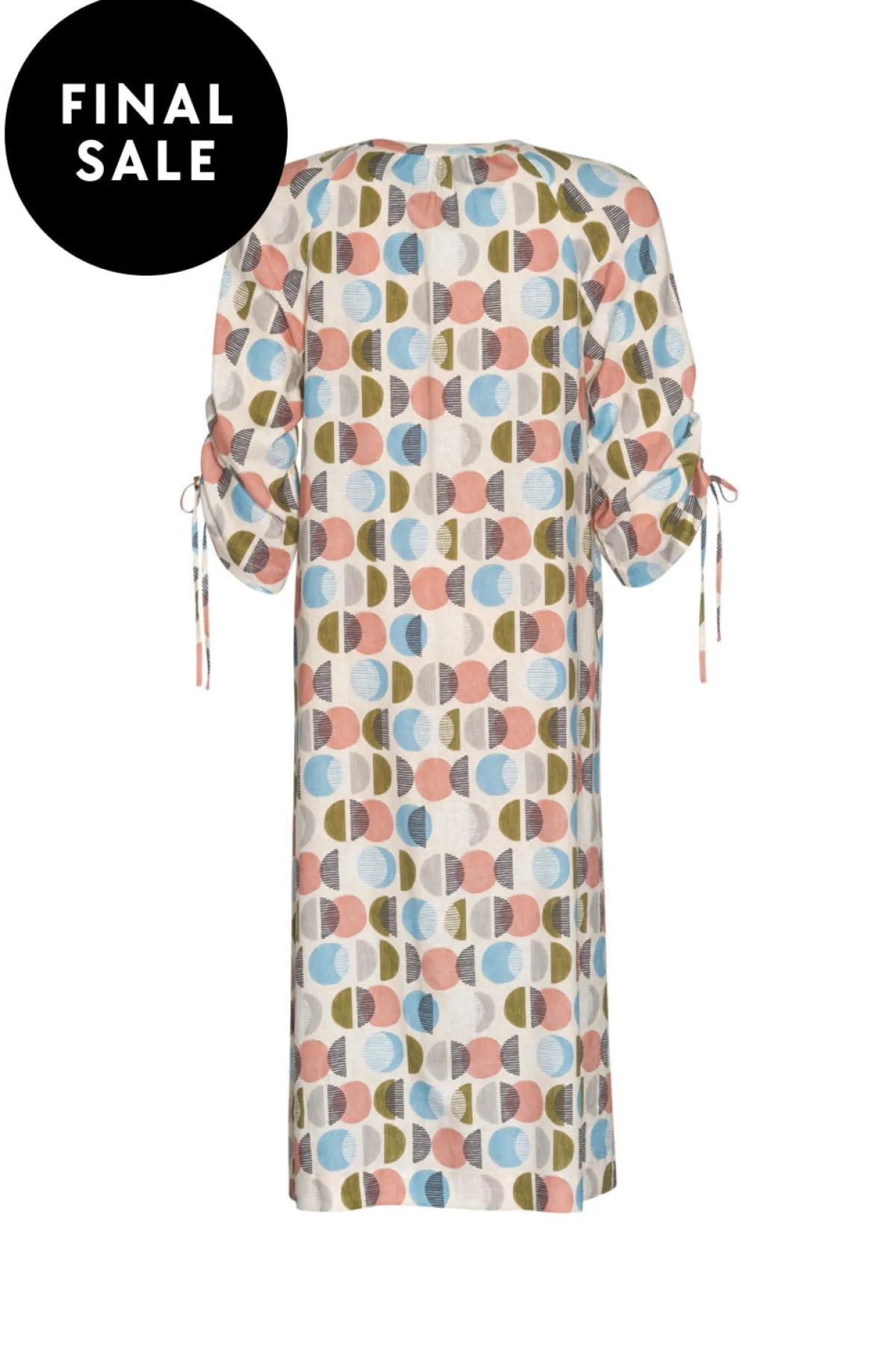 A-line midi dress with a V-neckline and 3/4 sleeves that can be ruched and tied, with stitched down side pockets and side splits.