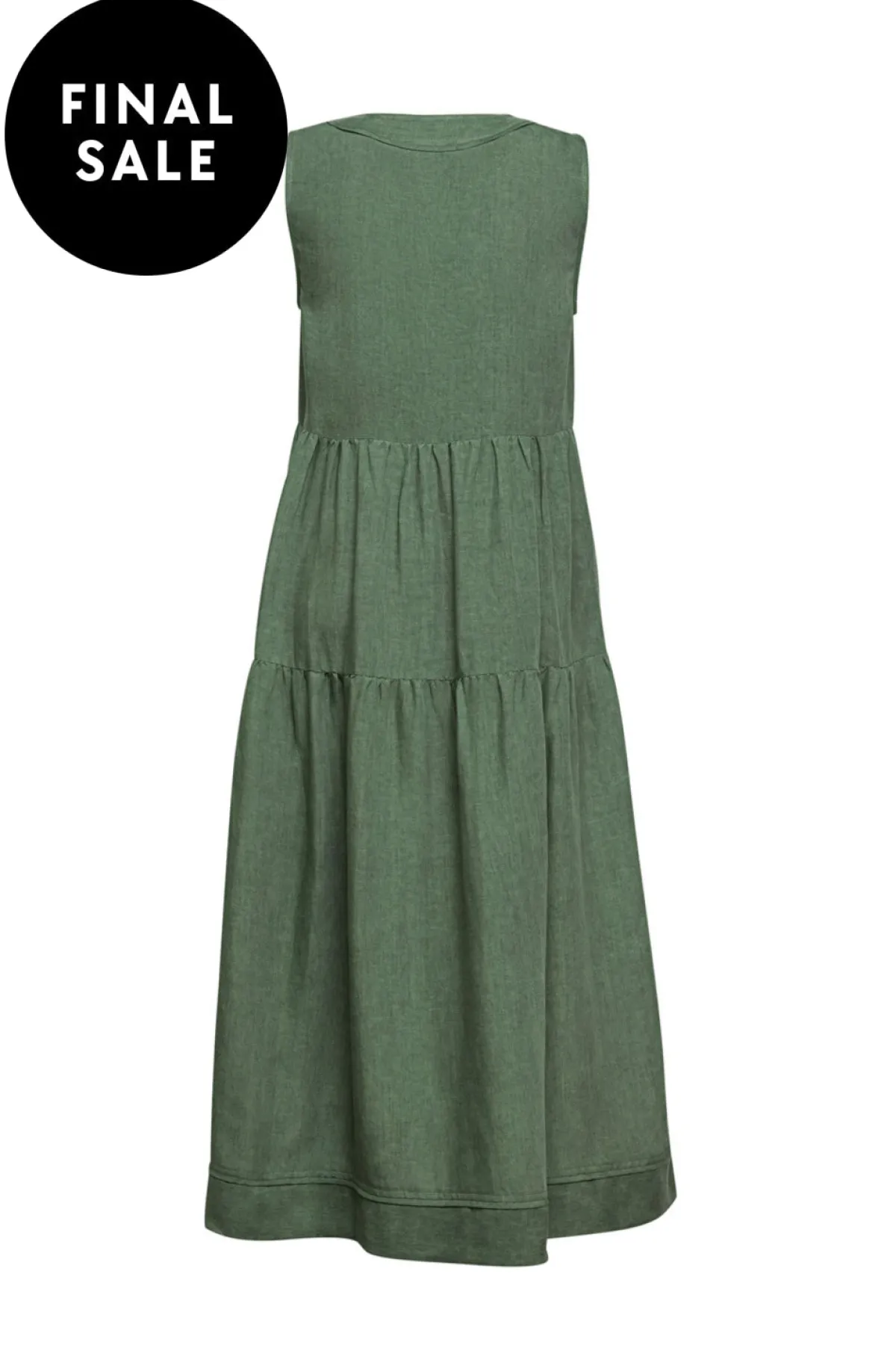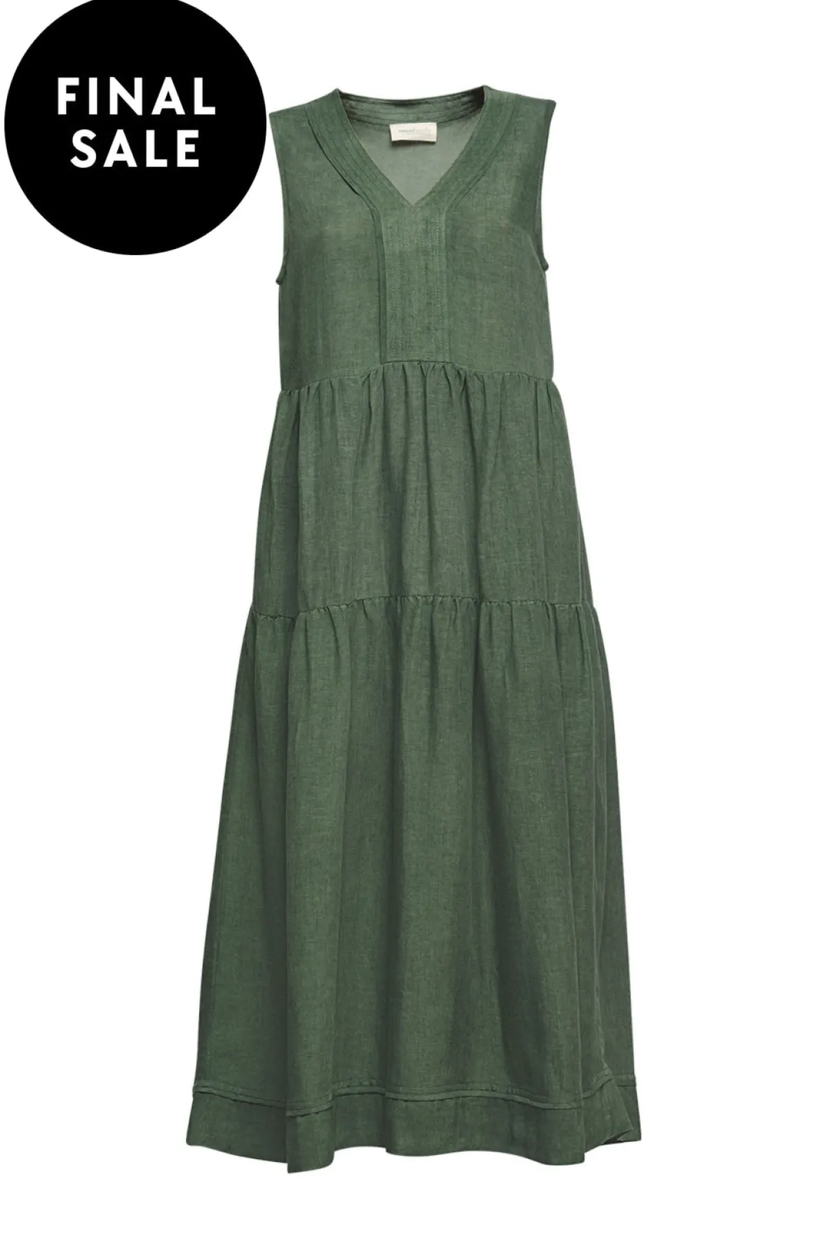 Sleeveless dress with a V-neckline and side pockets. Featuring top stitching detail around neckline, placket, and self binding at hemline seam.