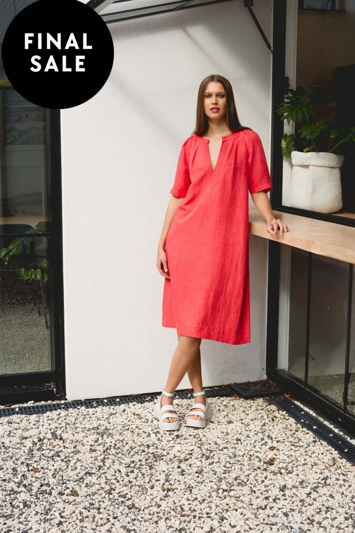 Knee length dress in a linen blend, with a round/V-neckline, featuring tucks around the neck opening and sleeve head.