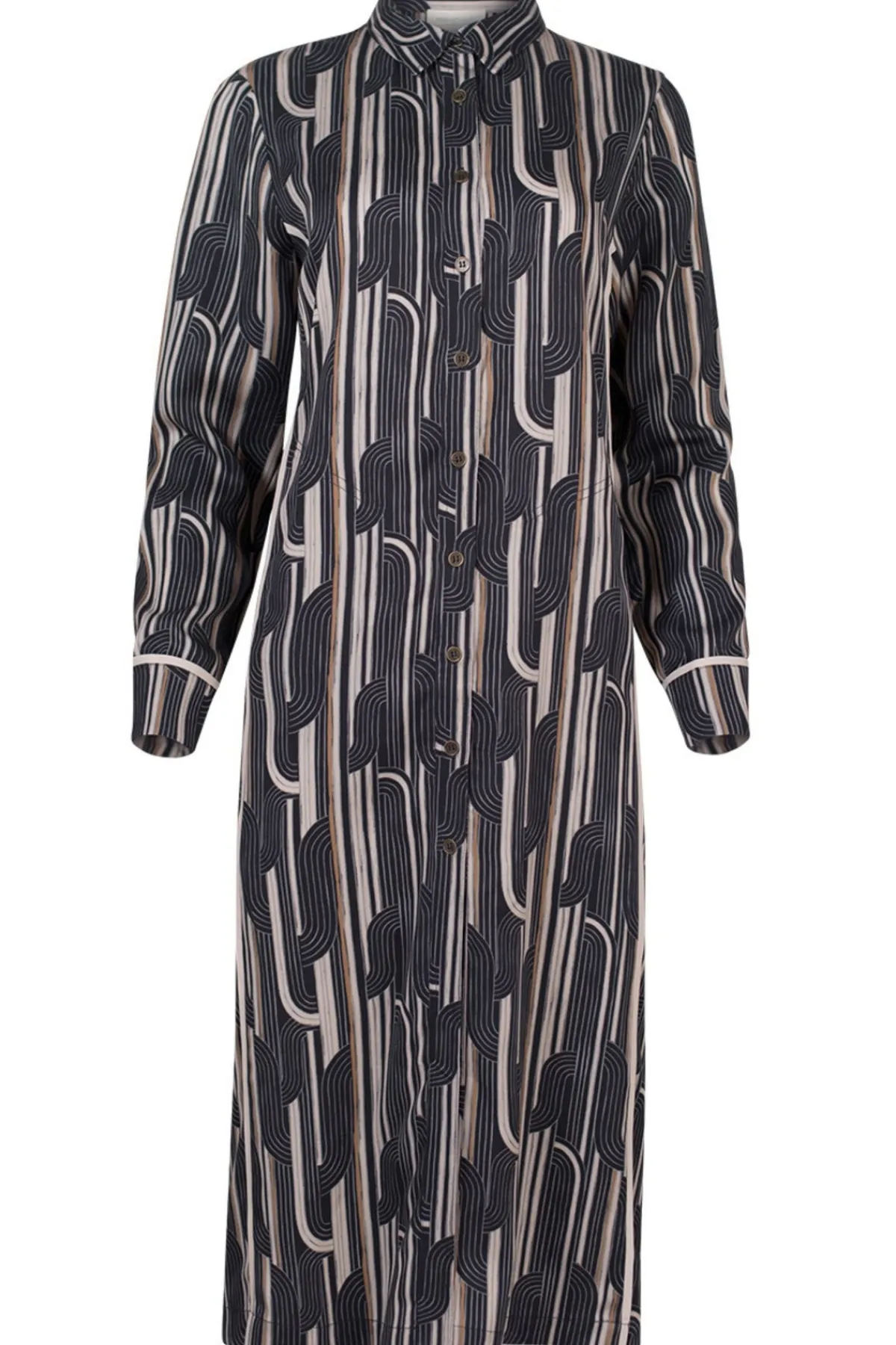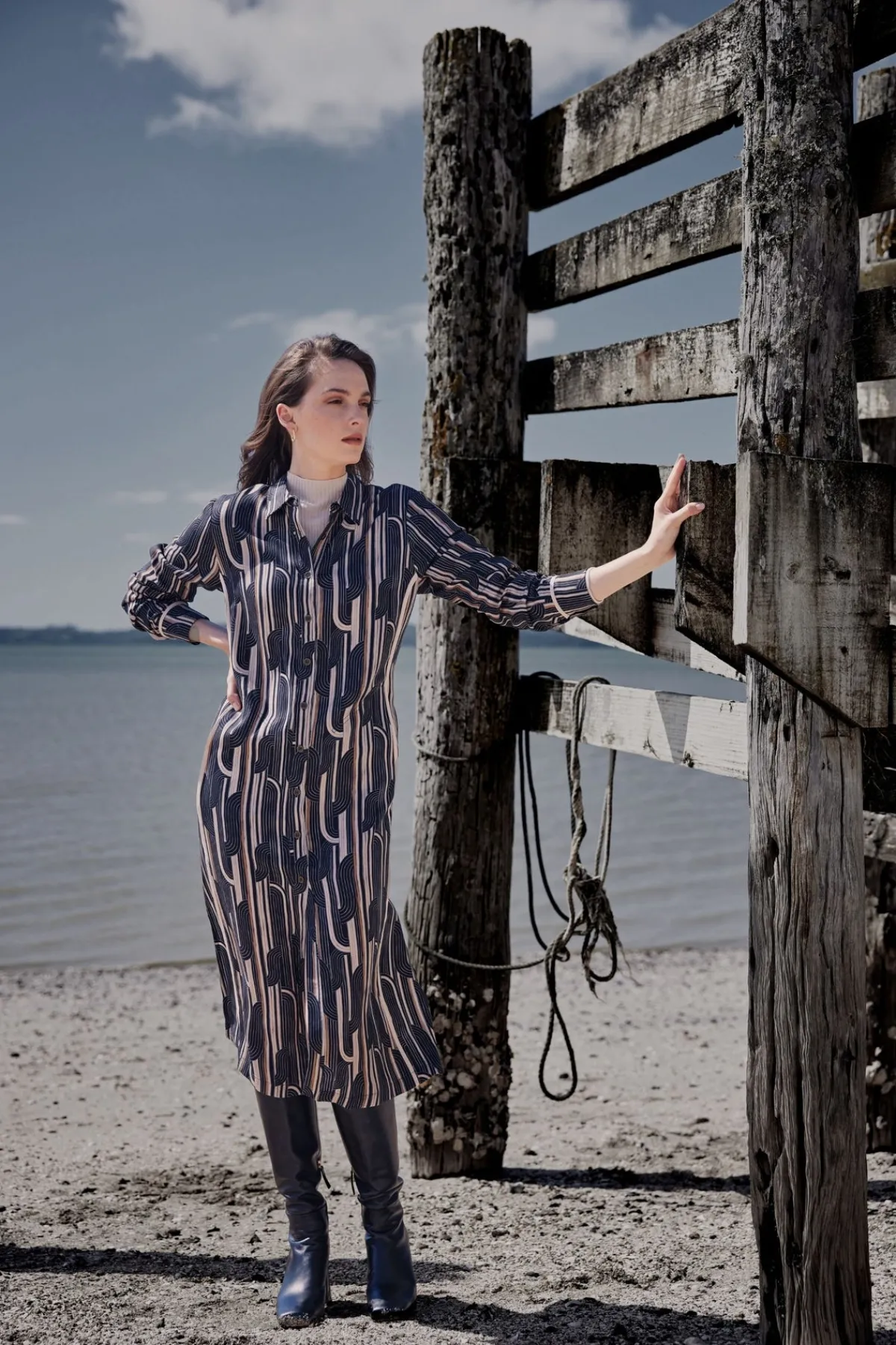 Striking winter dress that can be worn open over a top and pant as well! Button-through collared shirt dress with side splits and back waist elastic for shaping. Featuring contrast binding detail on cuffs, back yoke and side seams.