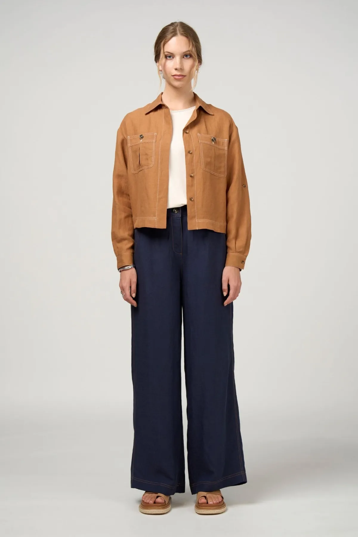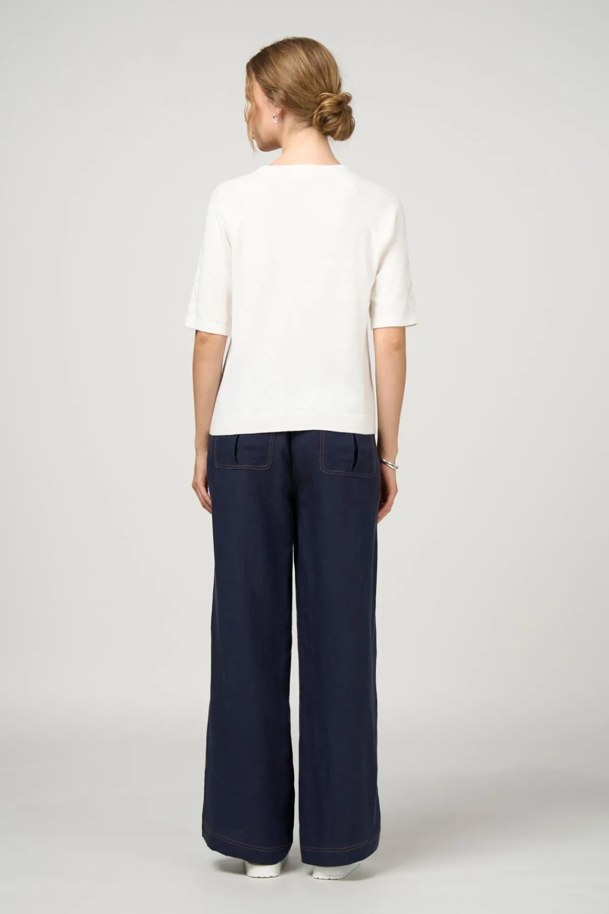 - Wide leg pant in a linen blend with back pockets and an elasticated back waist, featuring contrast twin needle detailing to elevate the styling.