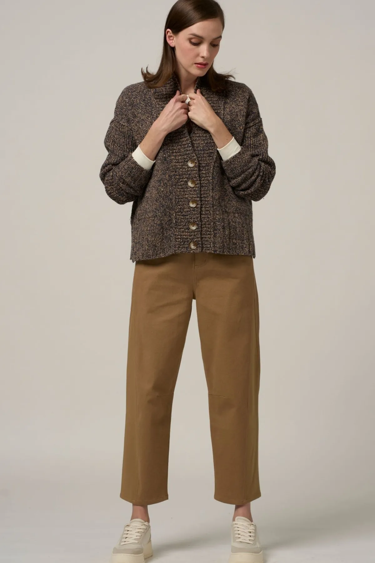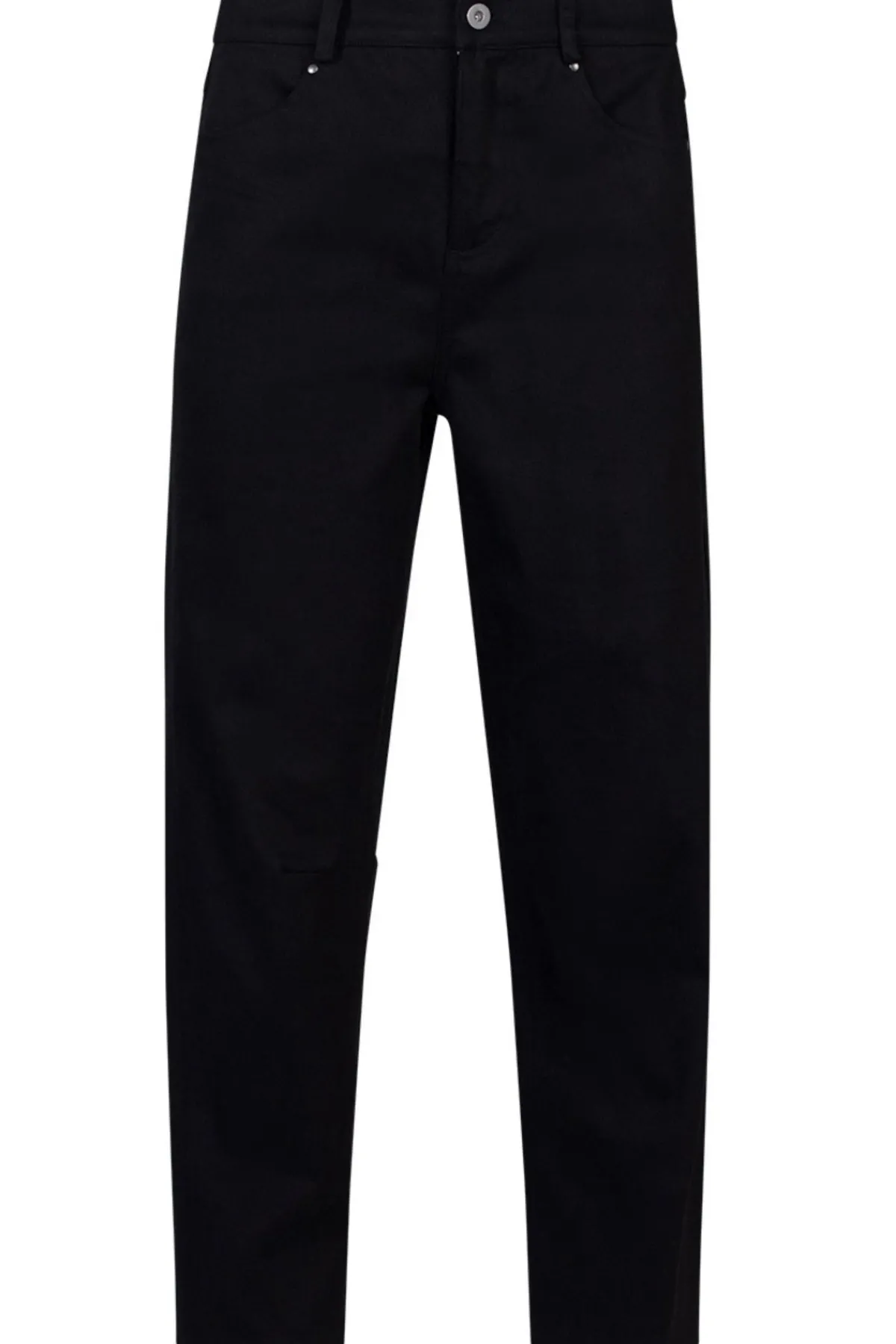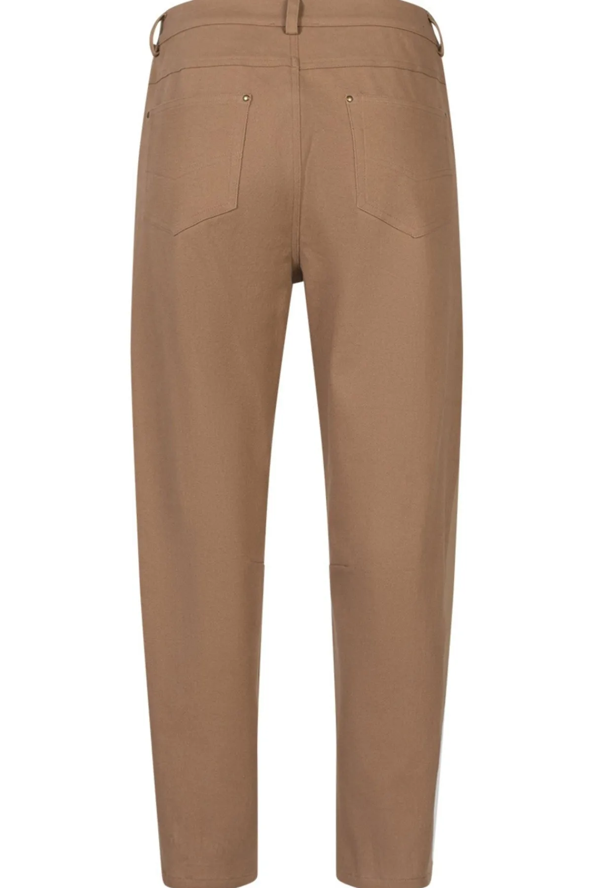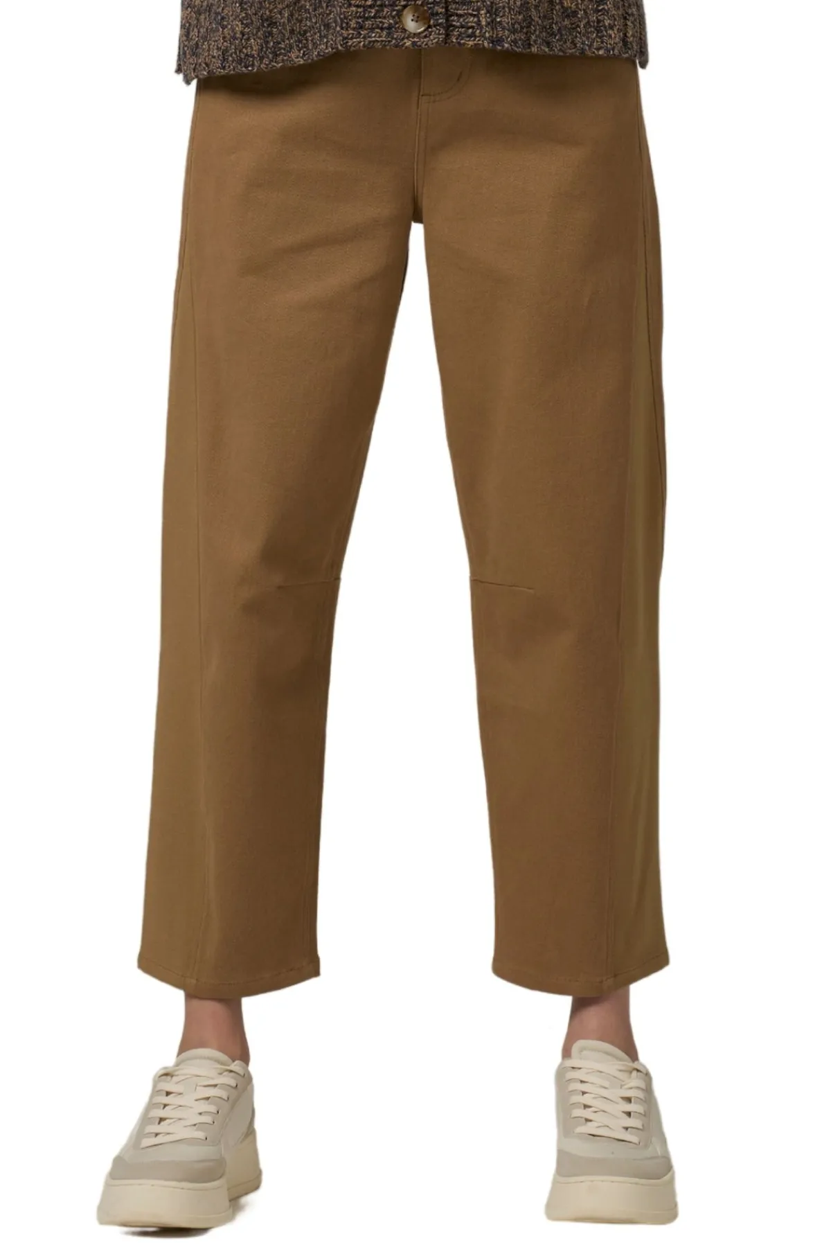 Relaxed cotton pant with front and back pockets, featuring angled ponte contrast panels.