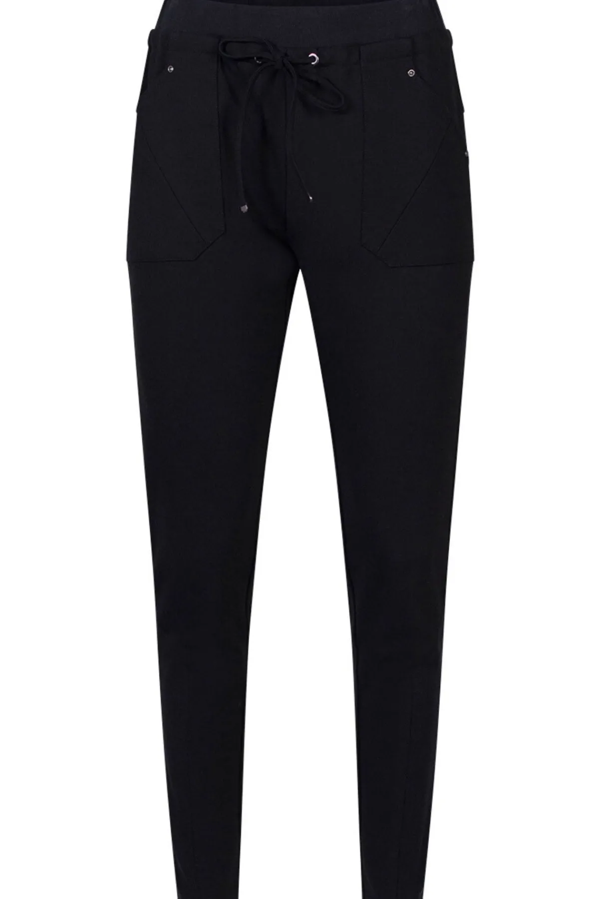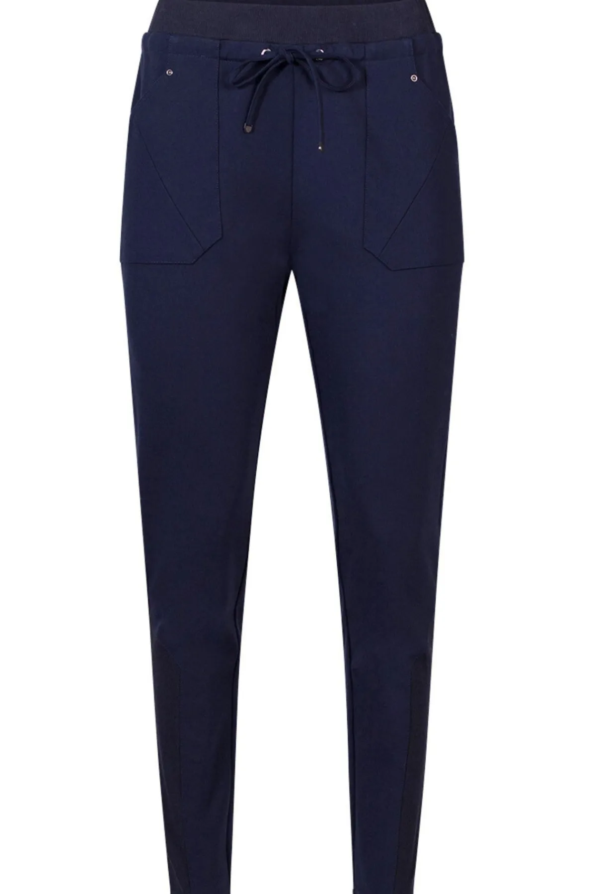 Slim fit ponte pant with a ribbed drawstring waistband, and ribbing panels at lower leg. Featuring geometric front pockets with metal studs.