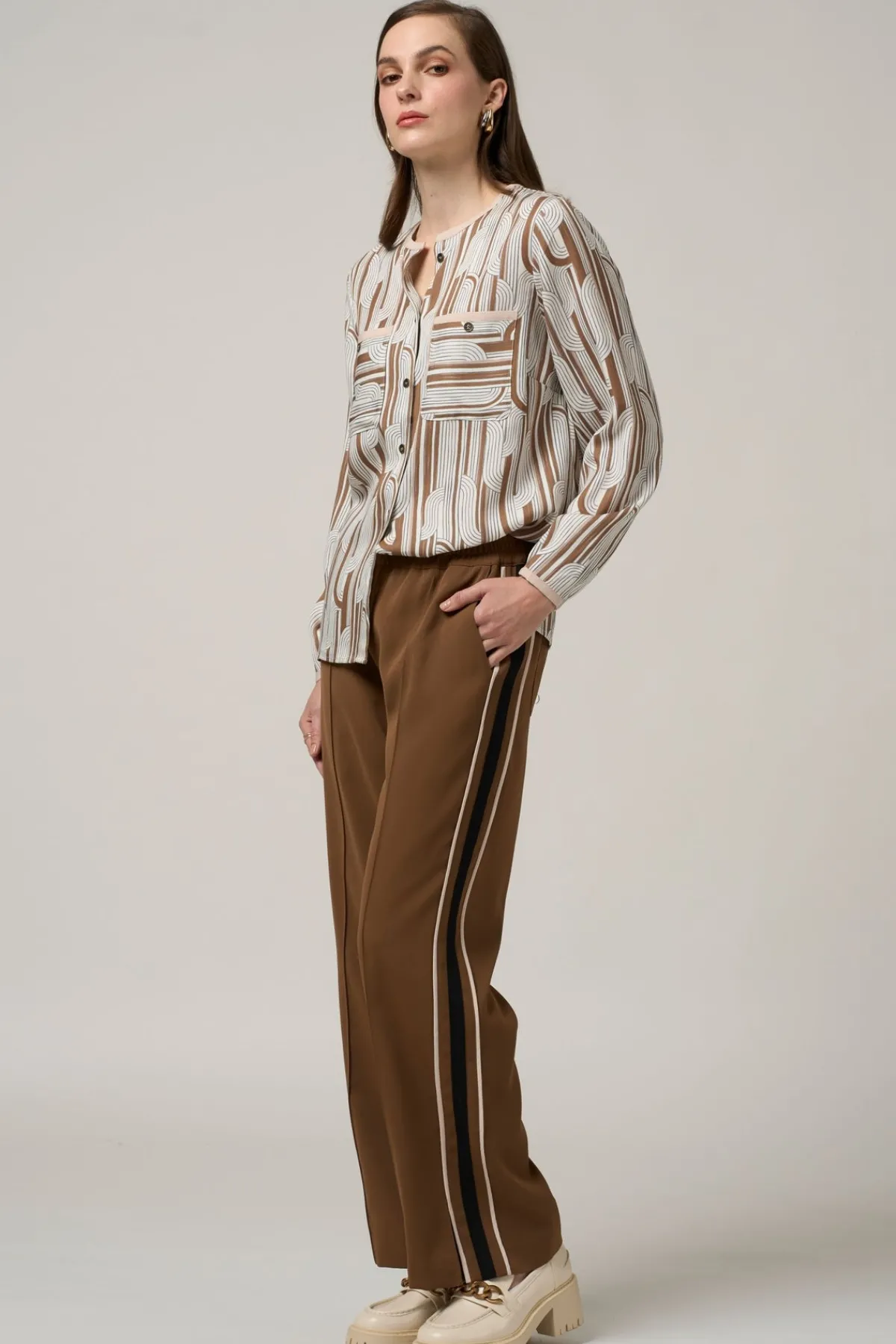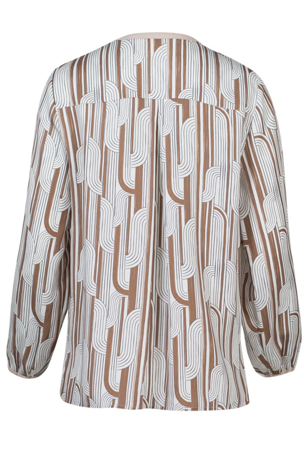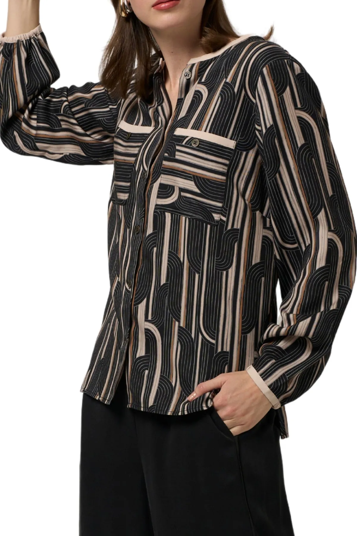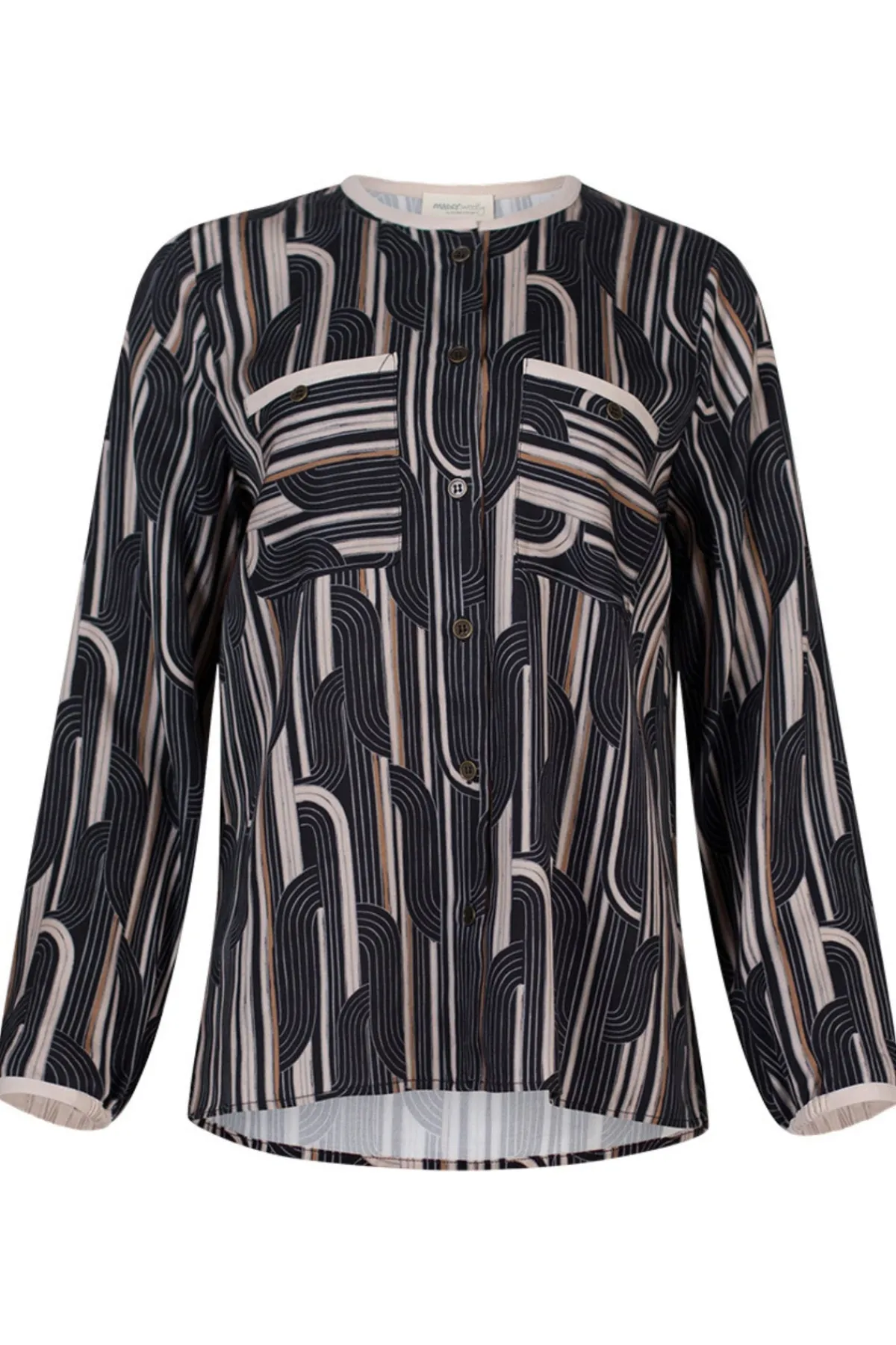 Stunning geometric print new from Madly Sweetly. Button-through top with metal buttons and pockets. Featuring contrast binding on neckline, pockets and cuffs.