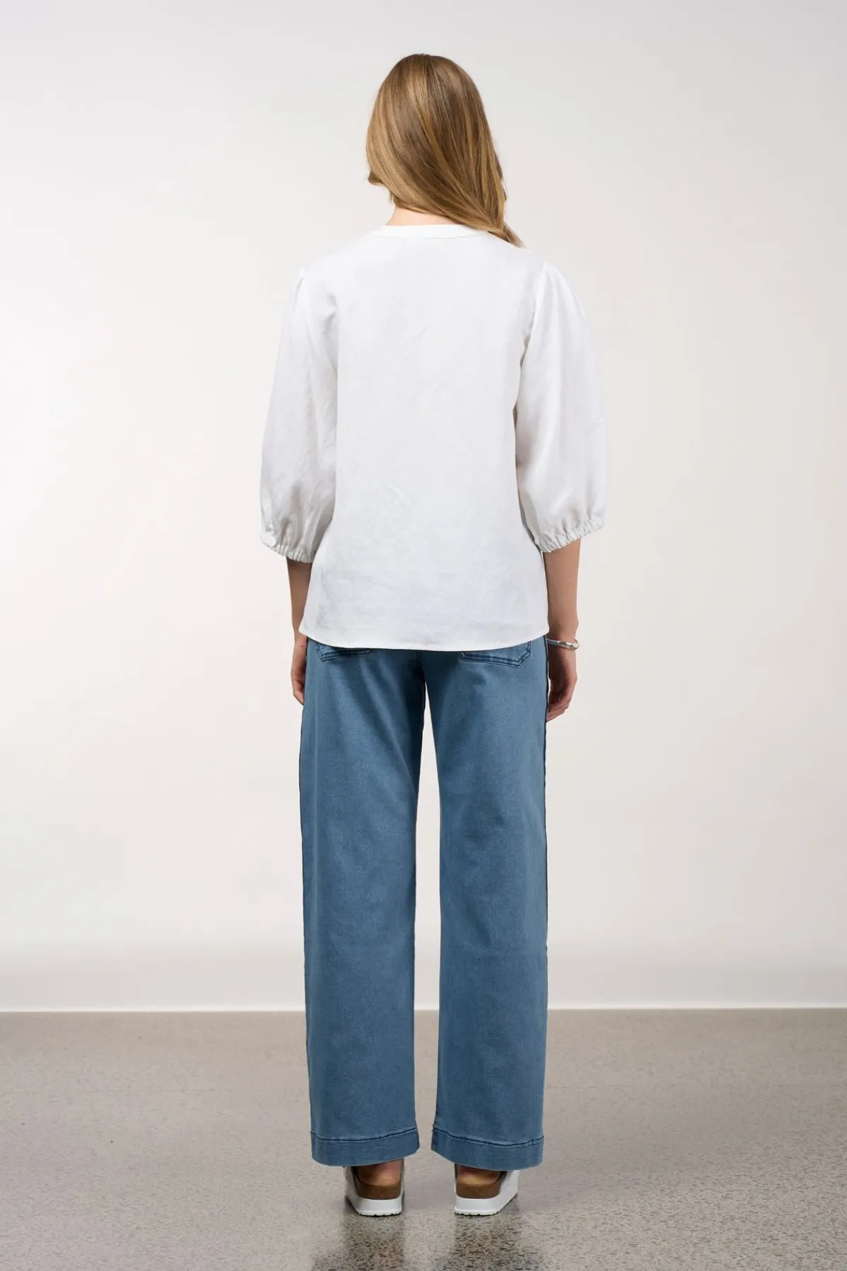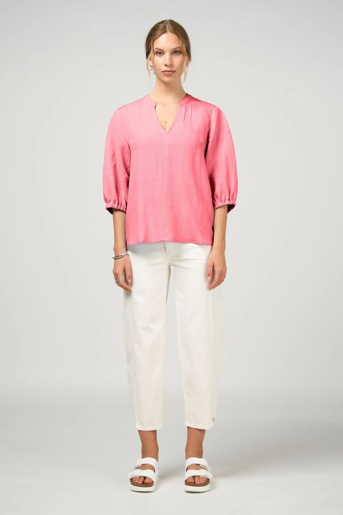 Relaxed fitting top with a V neckline, featuring fine pin-tuck detailing at the front neck and at the shoulder, with blouson sleeves and elasticated cuffs.