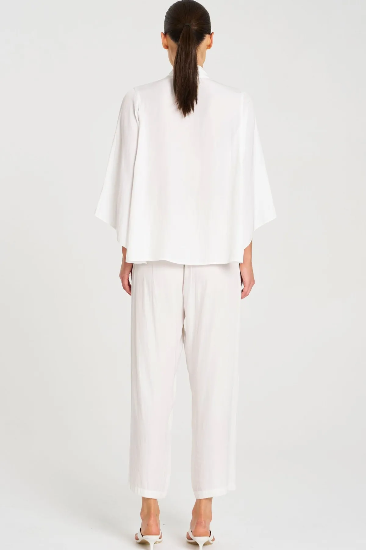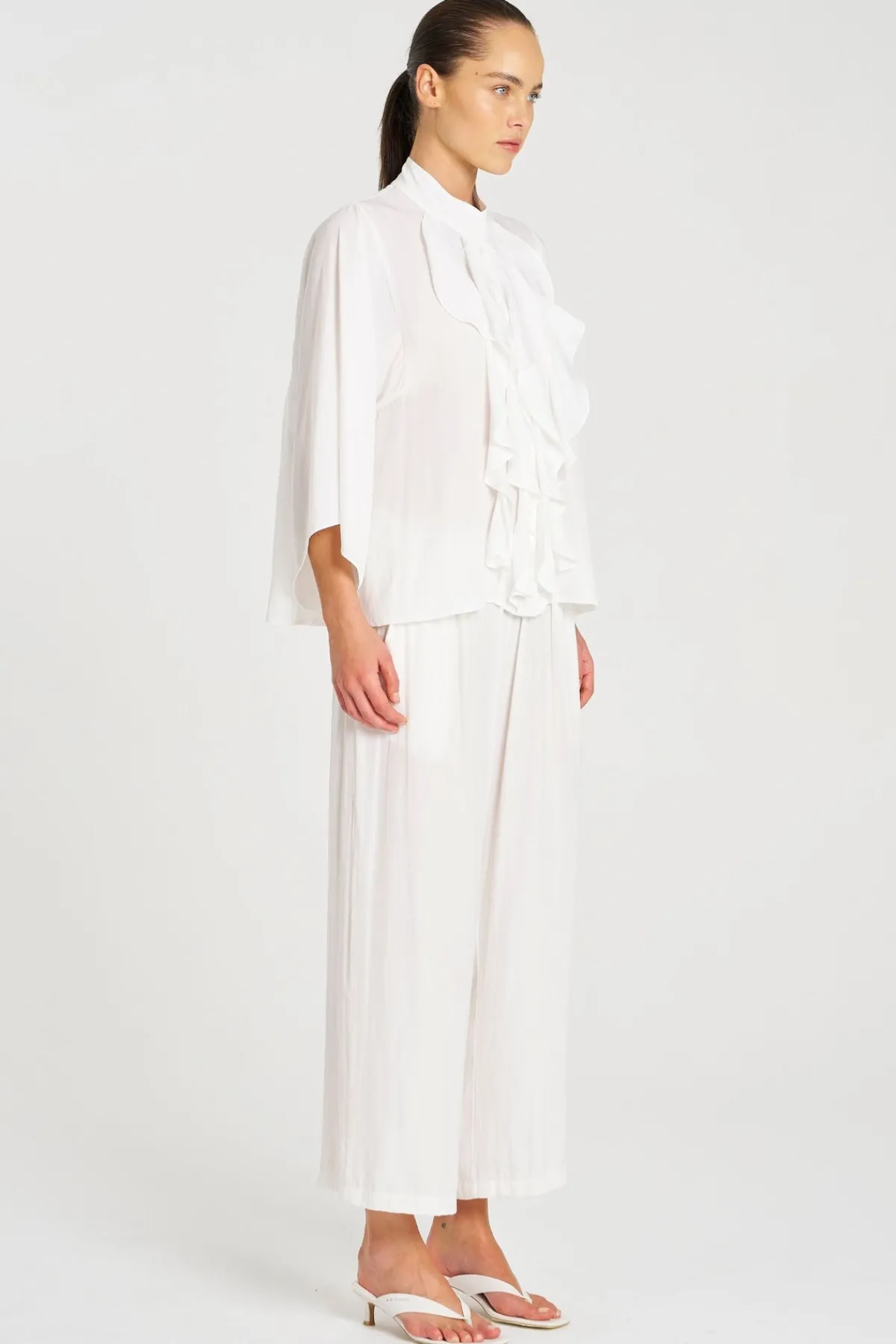 Crafted in Mela Purdie’s classic matte finish Powder Knit. The Fezz Blouse is an elevated piece, featuring ruffled panels down the front, a wide sleeve and stand collar.