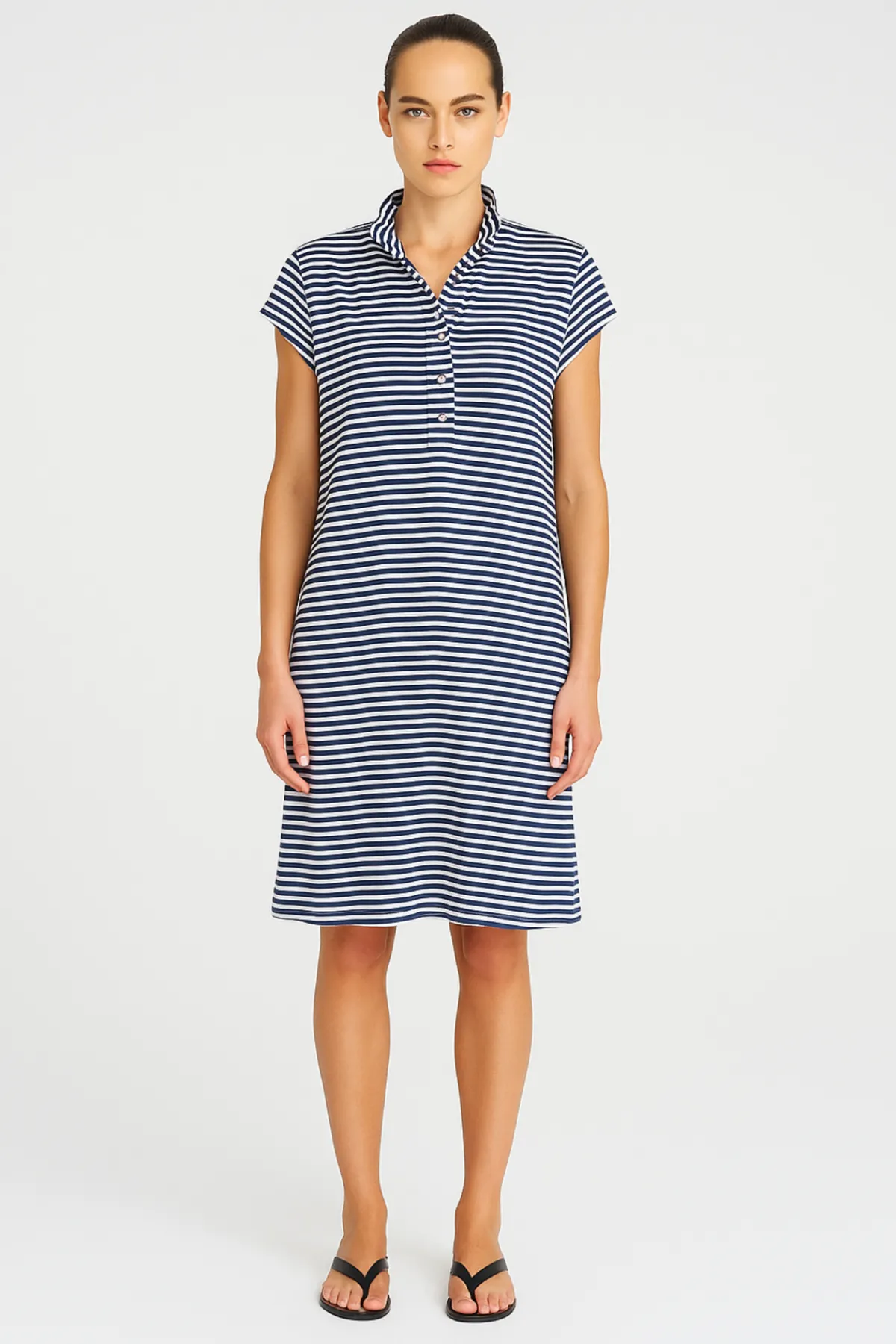 The Henley Dress is a flattering & versatile trans-seasonal piece featuring a cap sleeve and button closure through the collar. Crafted in the Yacht Stripe Jersey, this piece is a wardrobe essential.