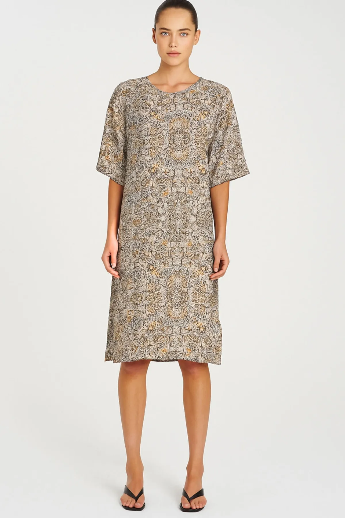 Crafted in Mela Purdie’s mid-weight, soft washed Silk Crepe De Chine, in the elevated Spinifex Print. The Plaza Dress features a relaxed silhouette with splits at the side seam.