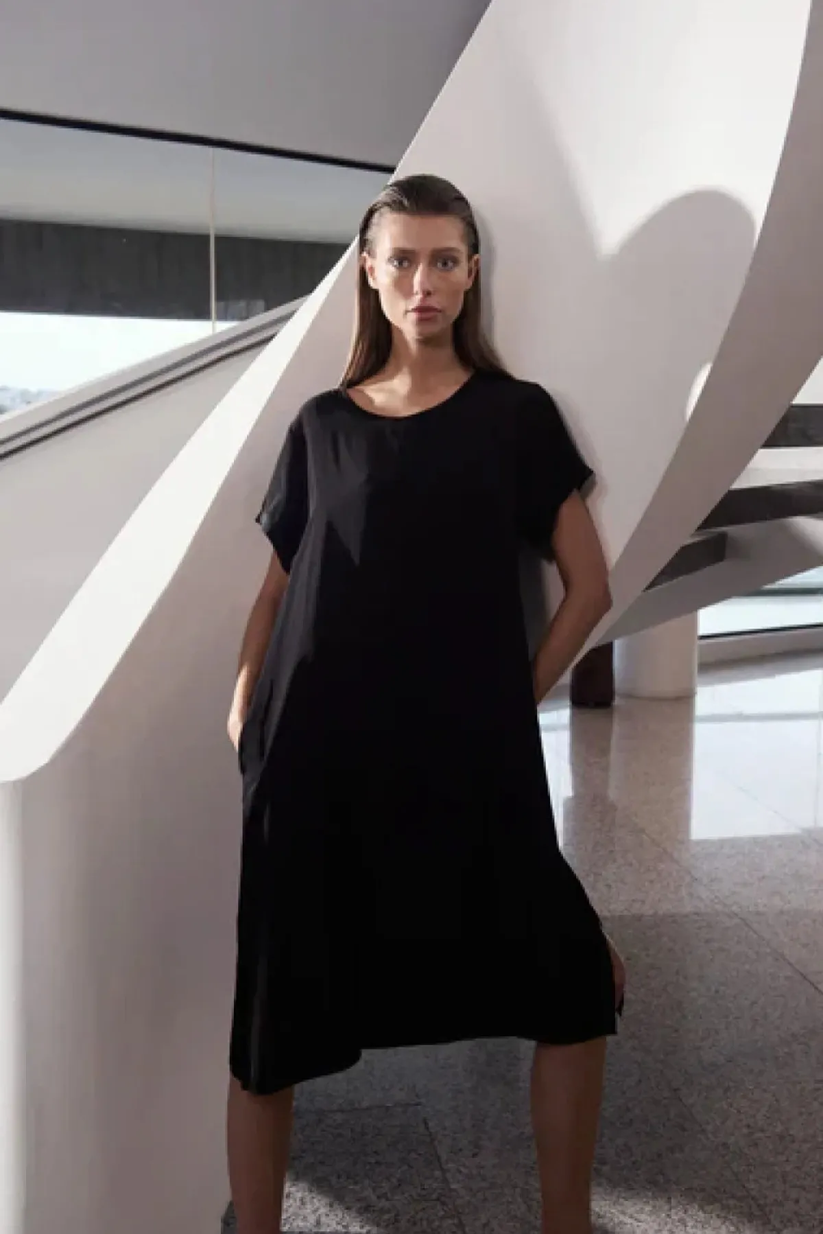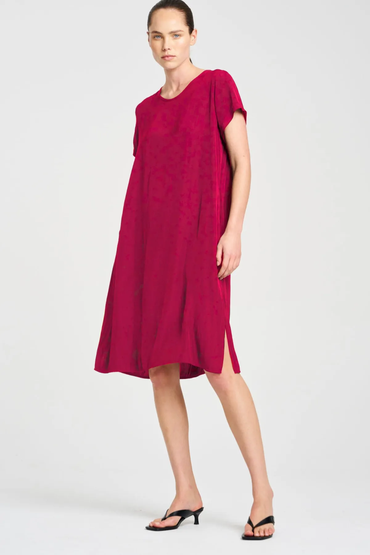 Crafted in Mela Purdie’s mid-weight Mache fabric. The Transit T Dress offers an effortless, loose fit. With a scooped neckline and flattering short sleeve.