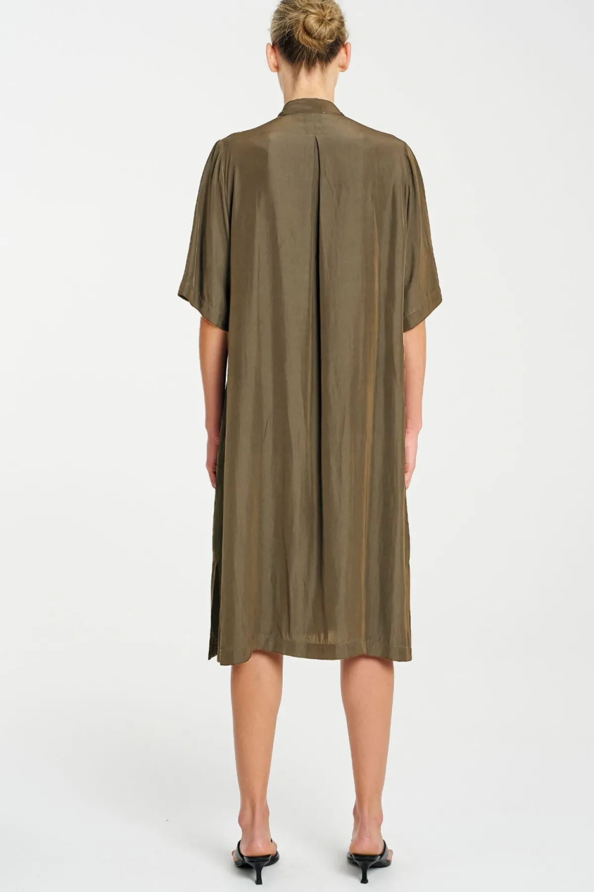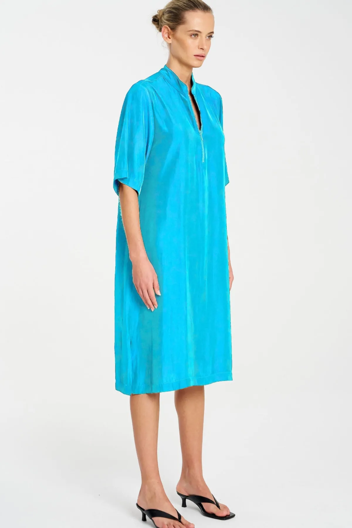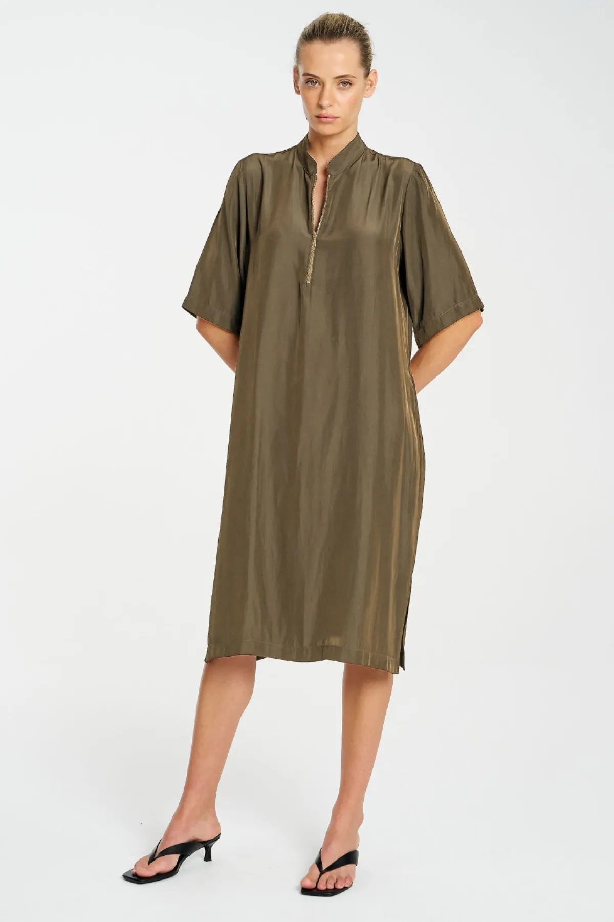Crafted from Mela Purdie’s Mache, featuring a relaxed fluidity & smooth lustre surface. The Zip Plaza Dress featuring a half front zip and crisp stand collar in a mid length this is an easy to wear staple for your capsule wardrobe.