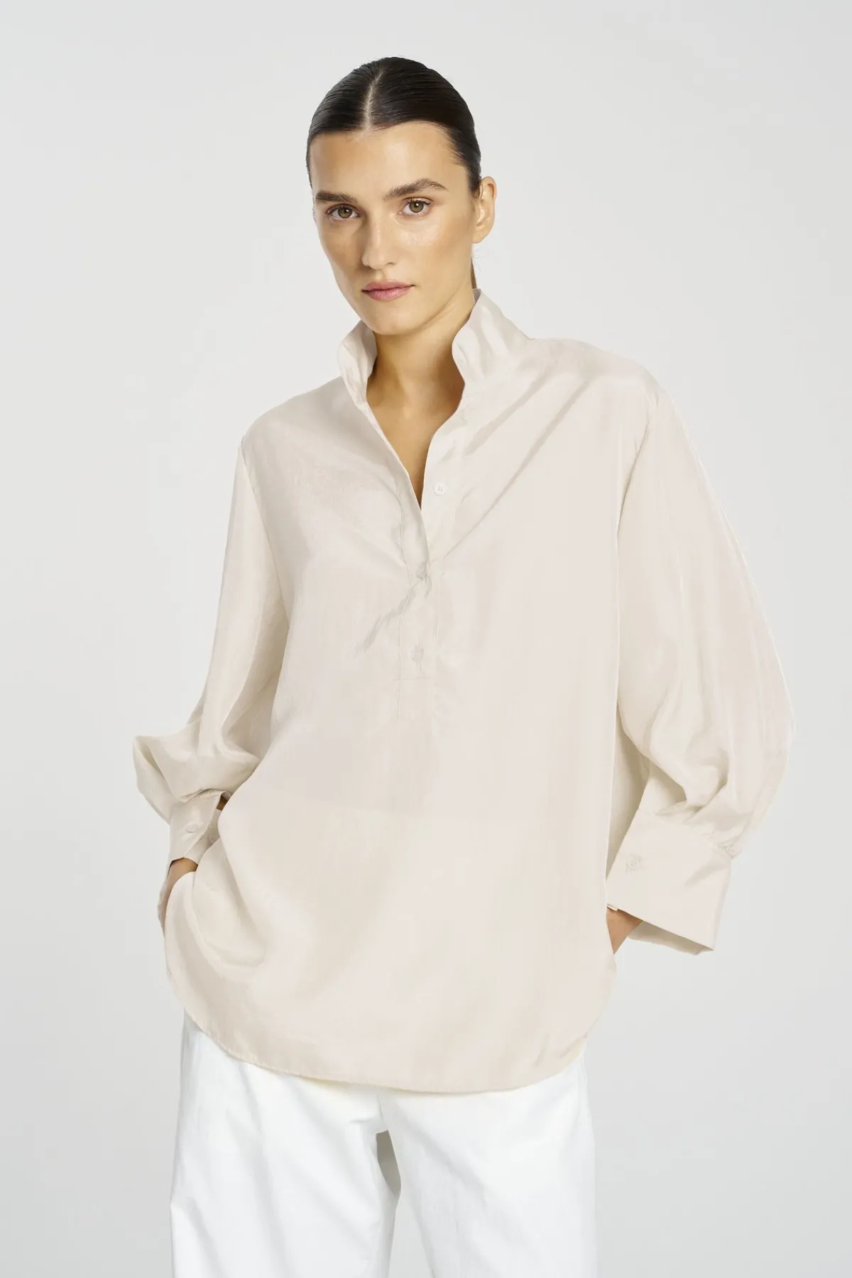 - Full length sleeves gathered into buttoned shirt cuffs