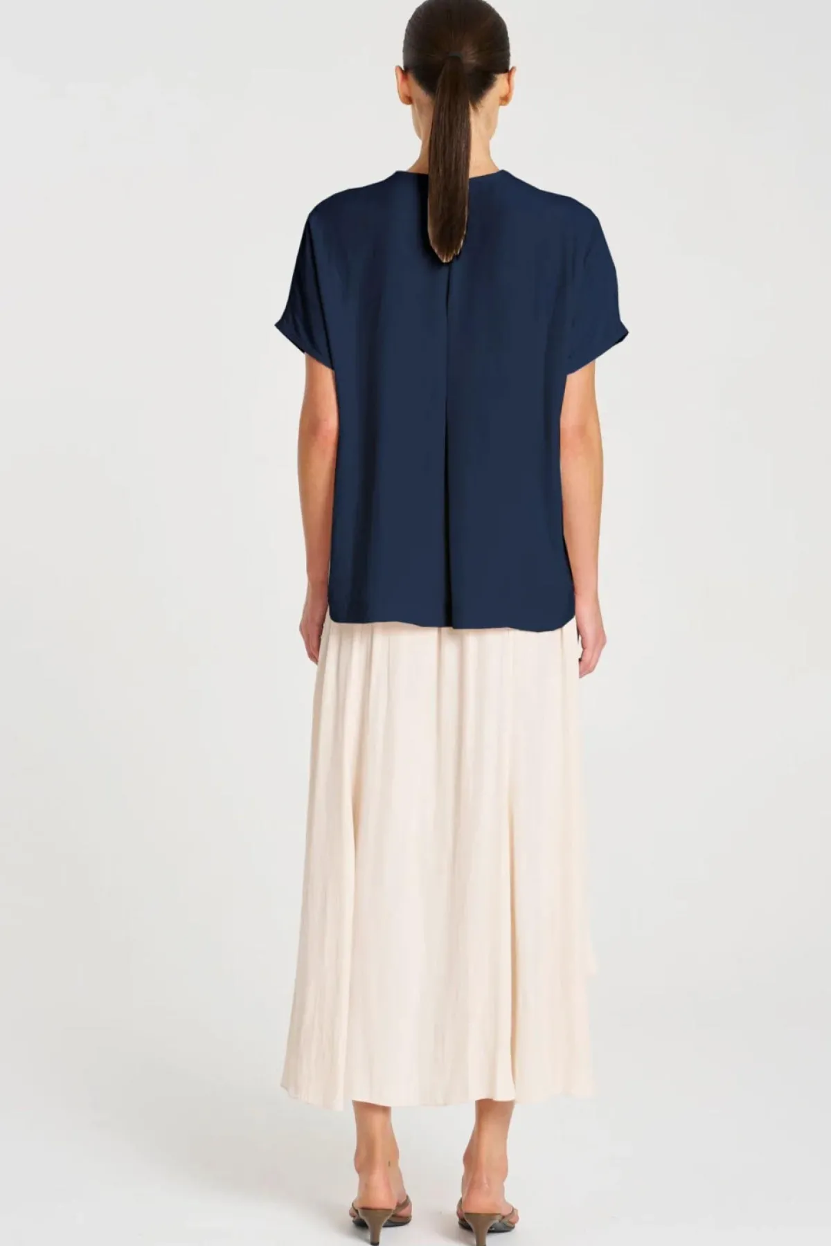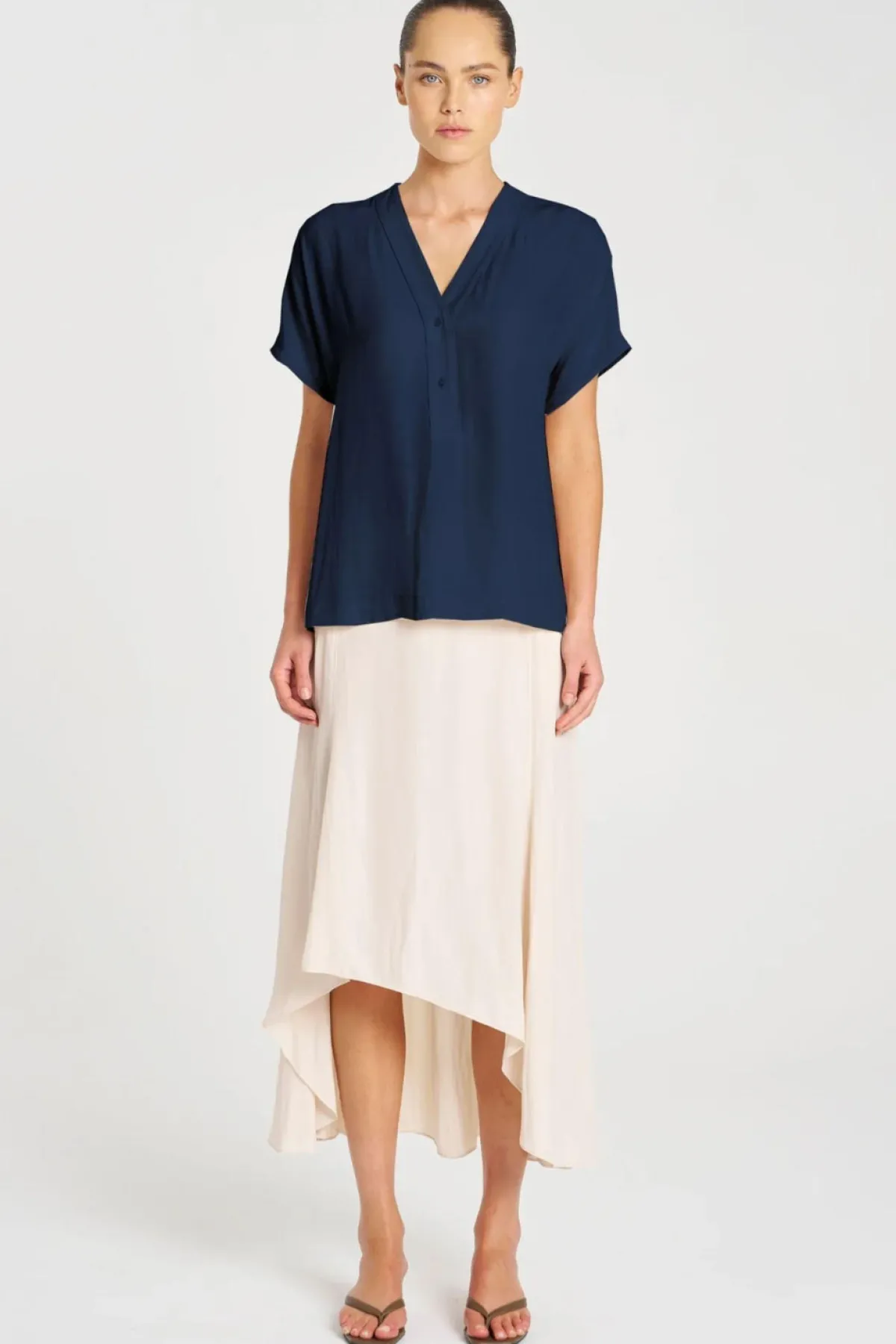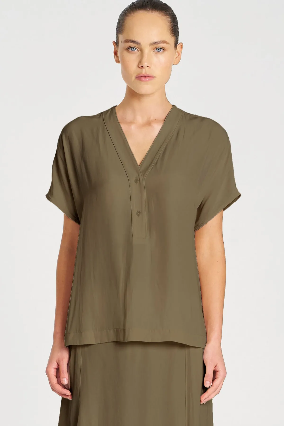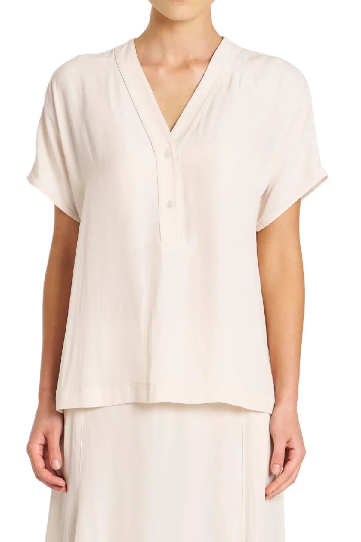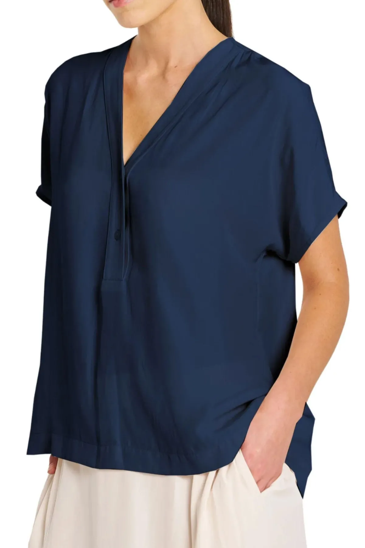 Crafted from Mela Purdie’s classic Mache, a fine Denier technical weave with an airflow finish. The Wedge Tab Shell features a cap sleeve and a flattering neckline with a button closure.
