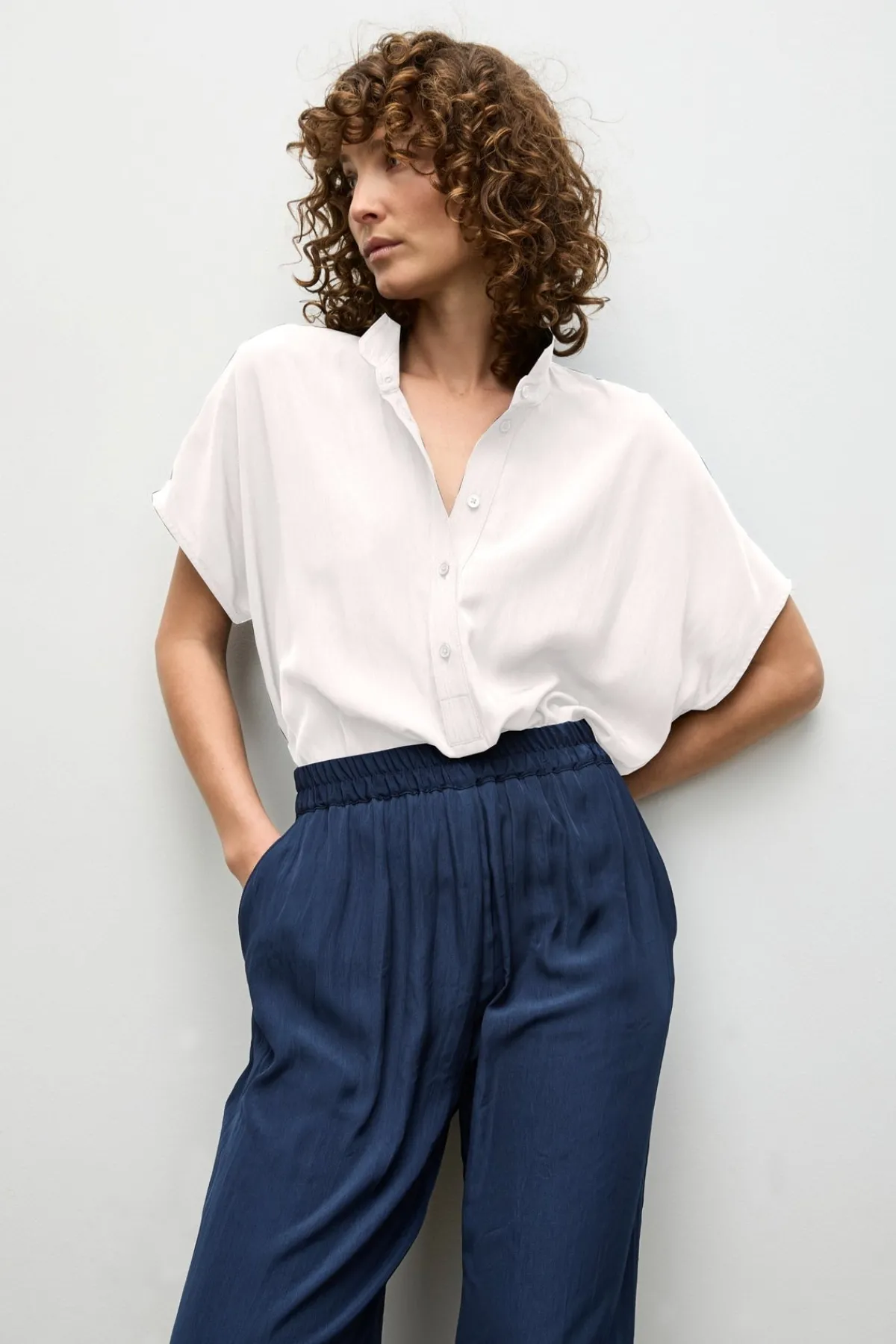 Crafted from Mela Purdie’s Mache, featuring a relaxed fluidity & smooth lustre surface. The Tab Stand Shell features a crisp front placket with button closure through the collar.