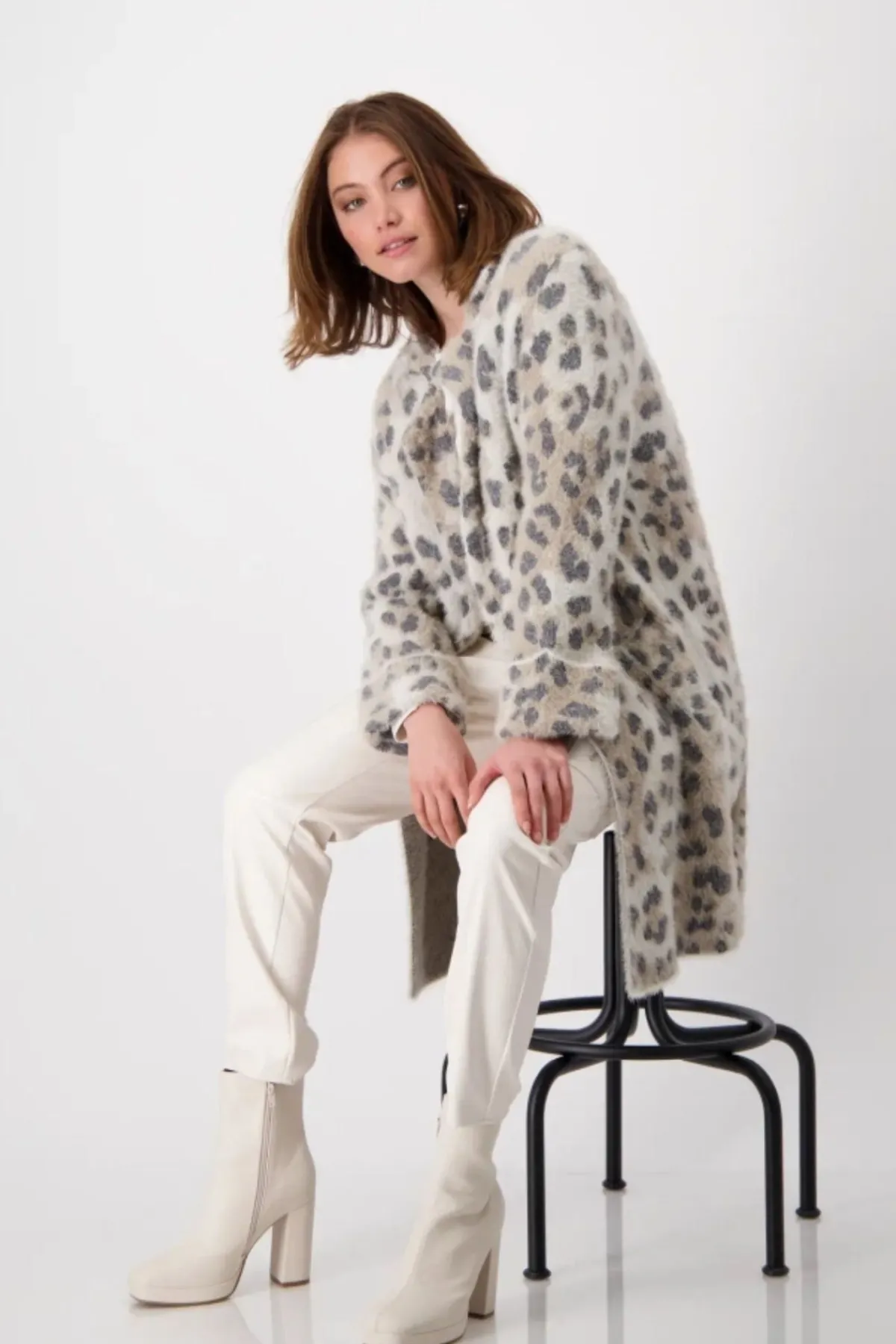 A longline coatigan with a animal print pattern and soft feel fabric. The fleecy, plush coat impresses thanks to its all-over leopard pattern in jacquard fabric. It has no closure and features practical in-seam side pockets.
