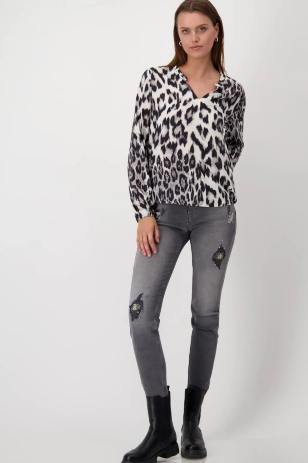 This blouse made of 100% viscose impresses with its trendy leopard print pattern and the elasticated band at the sleeve hem.