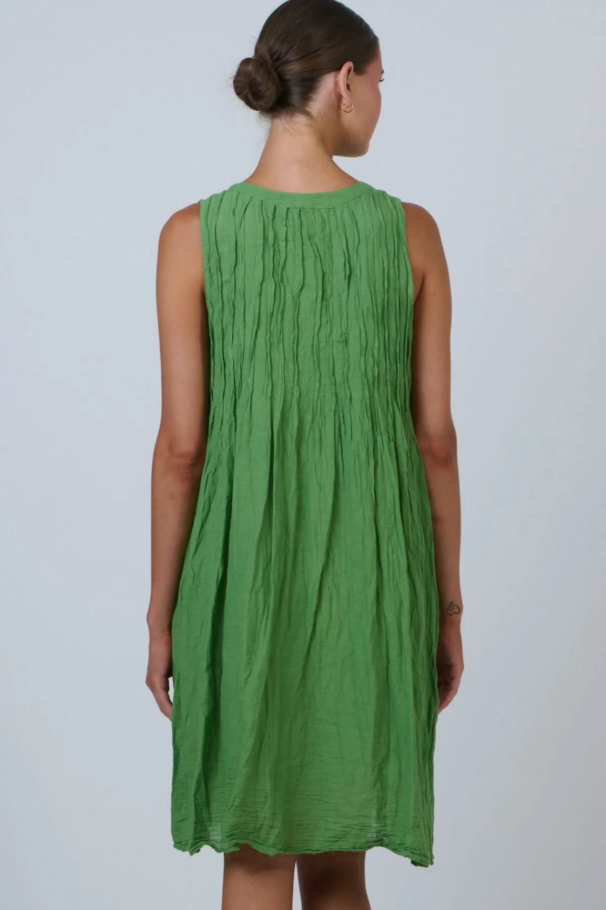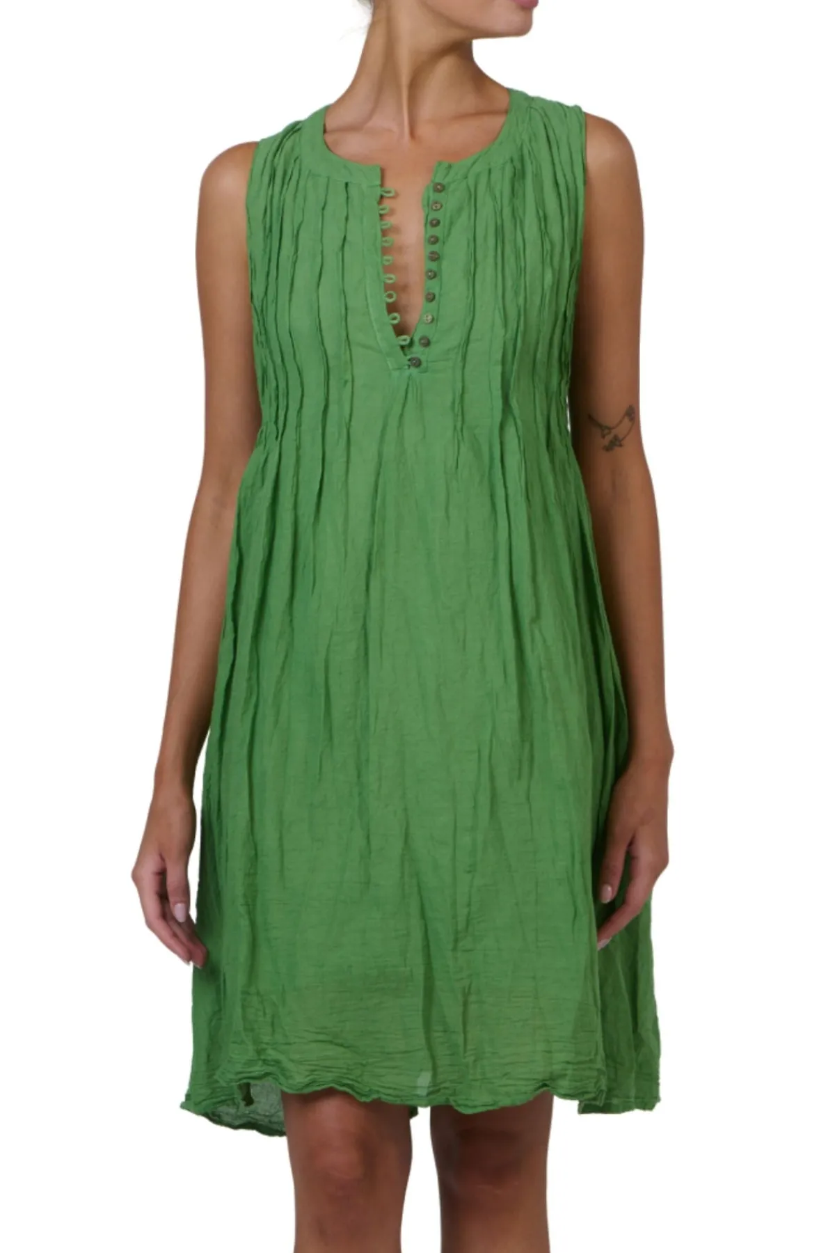 Feels like your own kind of quiet luxury. This sleeveless dress features a notched neckline with button accents and soft pleats that flow into a relaxed A-line silhouette. The artfully gathered 100% crinkle cotton creates natural texture and movement, offering a perfect balance of refined style and all-day comfort.