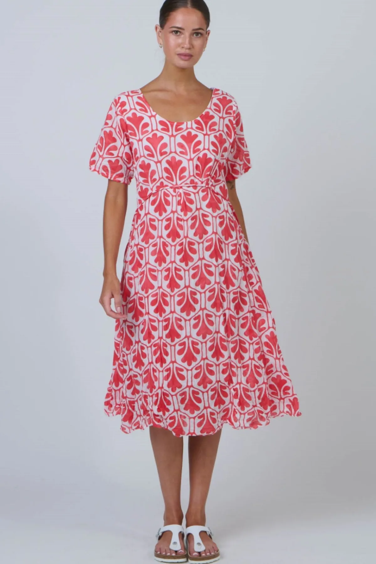 Easy charm, made to flatter. The Namastai Midi Dress is shaped with a defined waist, a soft scoop neckline, and flutter sleeves that move with ease. Crafted from breathable 100% crinkle cotton with hidden side pockets, it blends comfort and quiet elegance in one effortless piece.