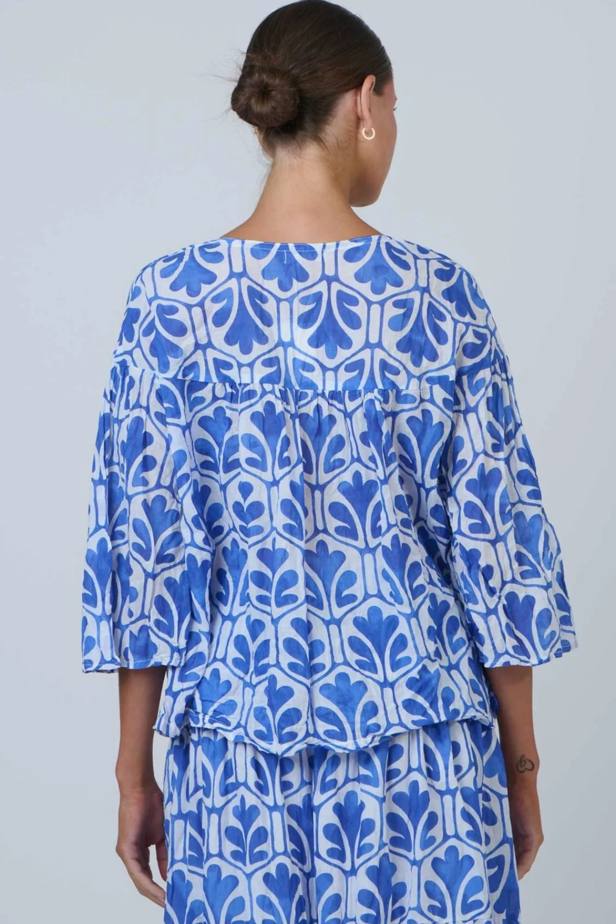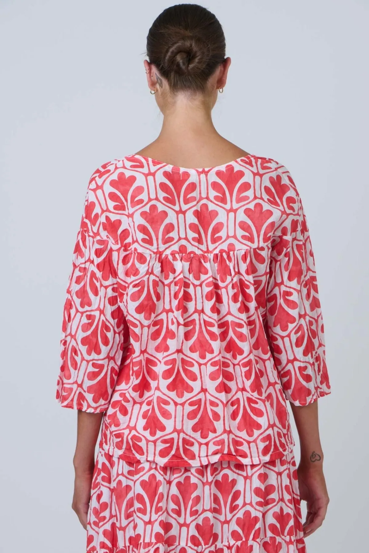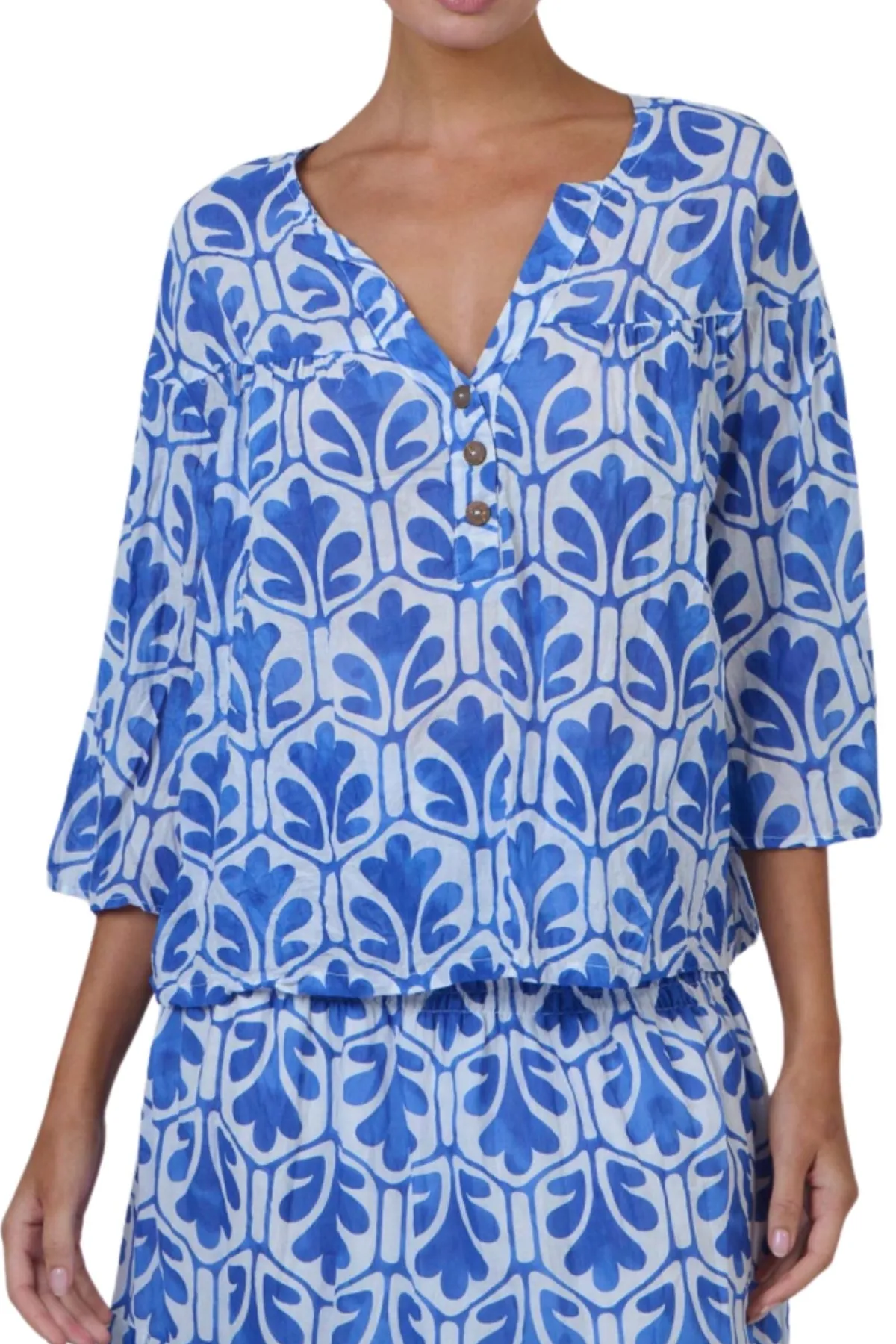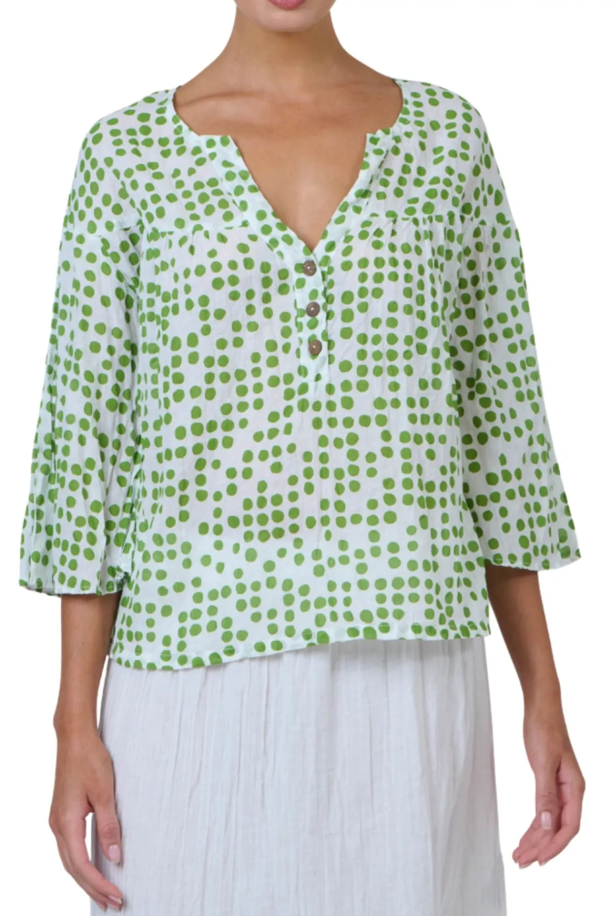 This 100% crinkle cotton Button Up Top shows off a carefree vibe with its relaxed V-neckline. Two charming wooden buttons let you decide between open or closed, while breezy three-quarter sleeves add a touch of flow. A sweet gathered detail above the bust creates a flattering, fun fit.