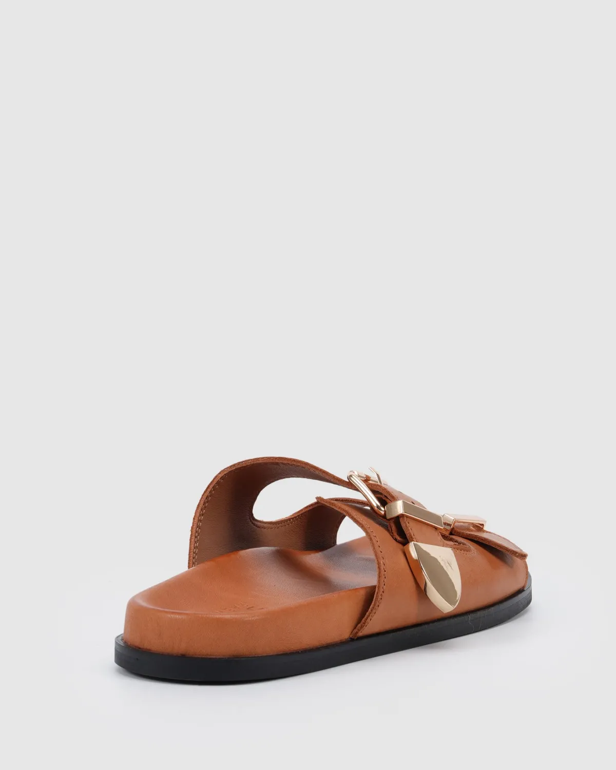 Elevate your summer wardrobe with the SINA SLIDE, designed for effortless style and comfort. This on-trend slide features a luxurious leather upper and lining, ensuring durability and a premium feel. The tan colour pairs seamlessly with any outfit, while chic rose gold buckles add a refined touch. Perfectly crafted for warm weather, these slides offer both sophistication and practicality.
