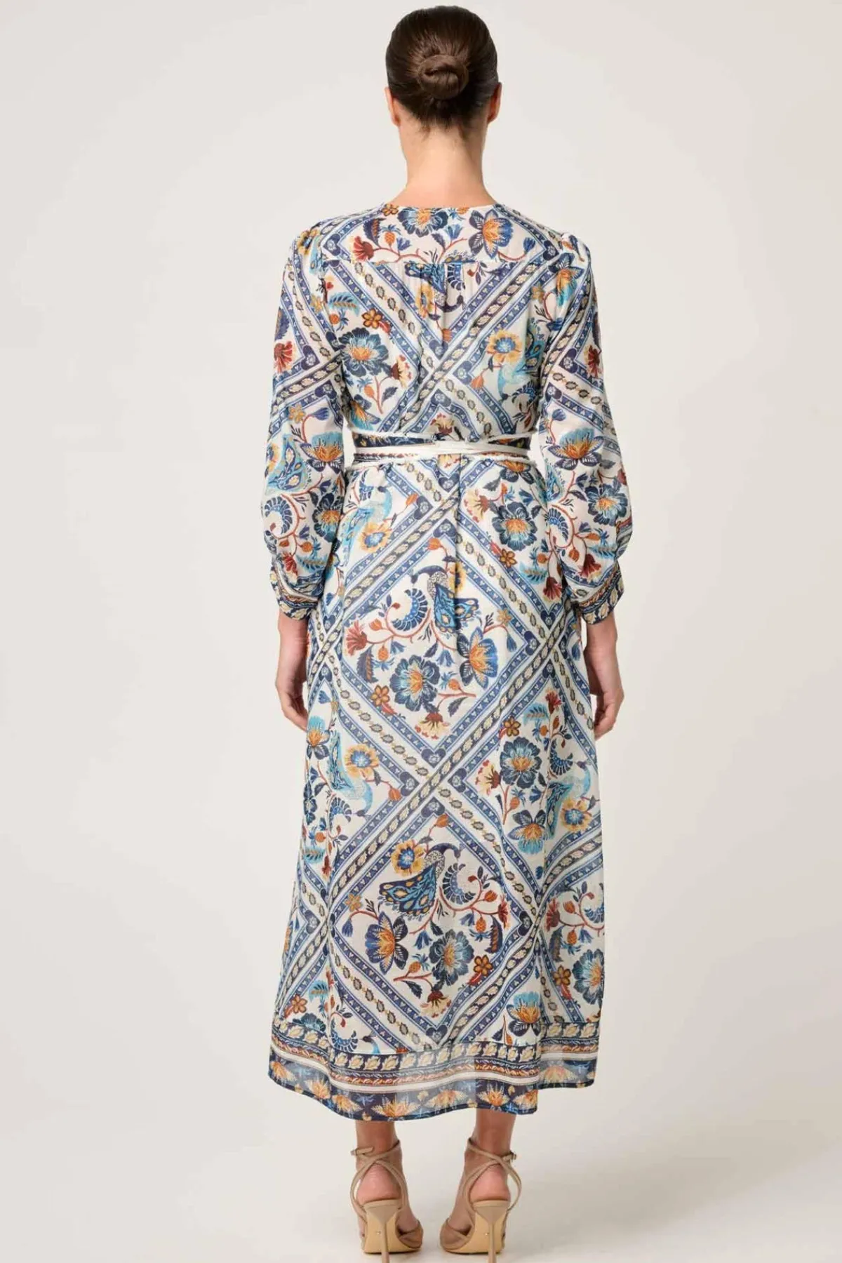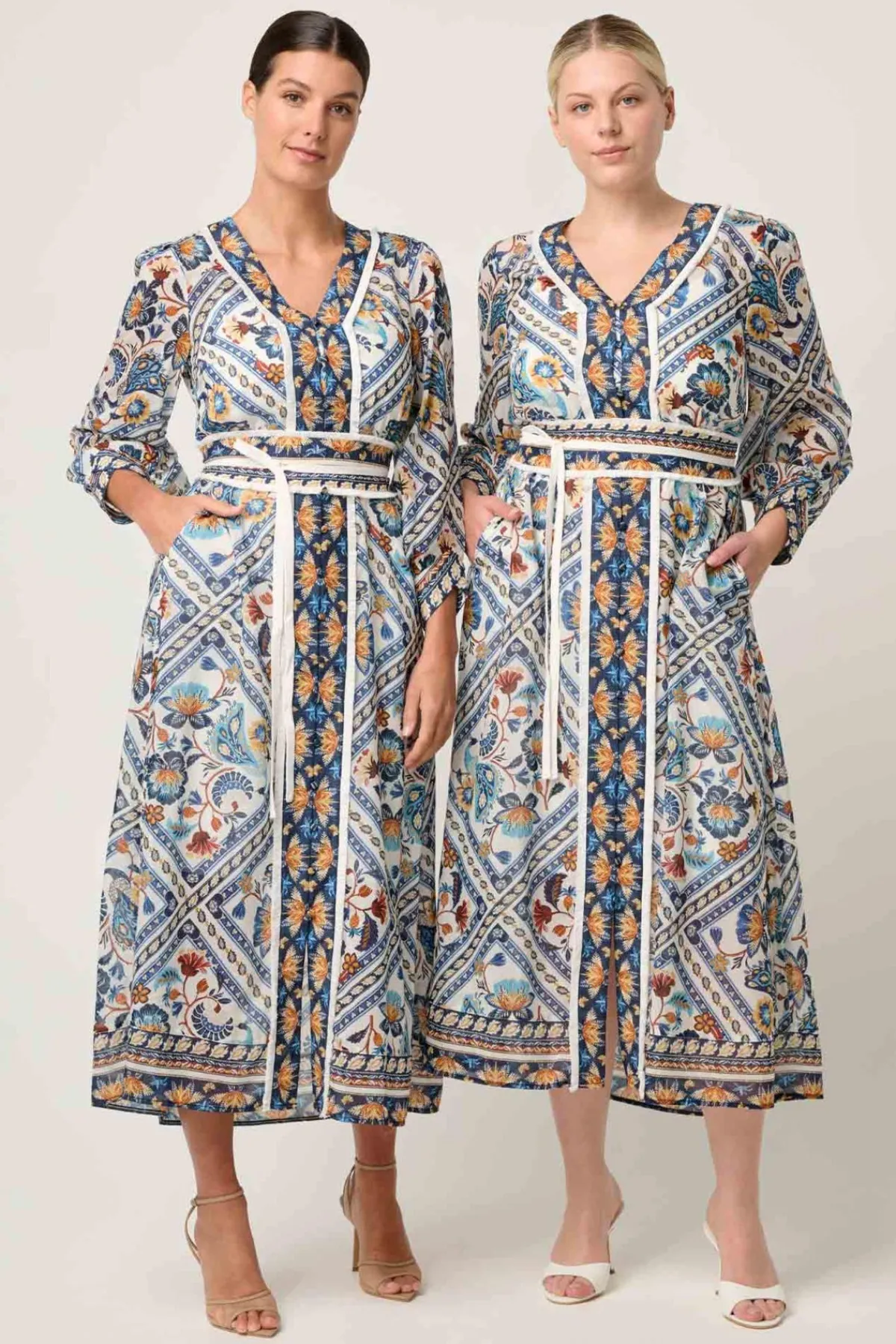 Step into effortless elegance with the Alexis Silk Cotton Midi Dress in Petinos Floros – where artisan-inspired florals meet refined modern tailoring. Crafted from a luxurious silk-cotton blend, this airy midi dress features a botanical mosaic of sun-drenched florals in hues of indigo, terracotta, and marigold. The silhouette is thoughtfully detailed with a contrast trim and a self-tie rope belt to define the waist, creating a flattering and feminine shape. Whether you’re wandering a coastal town or attending a garden soirée, the Alexis dress offers the perfect balance of laid-back grace and elevated charm.