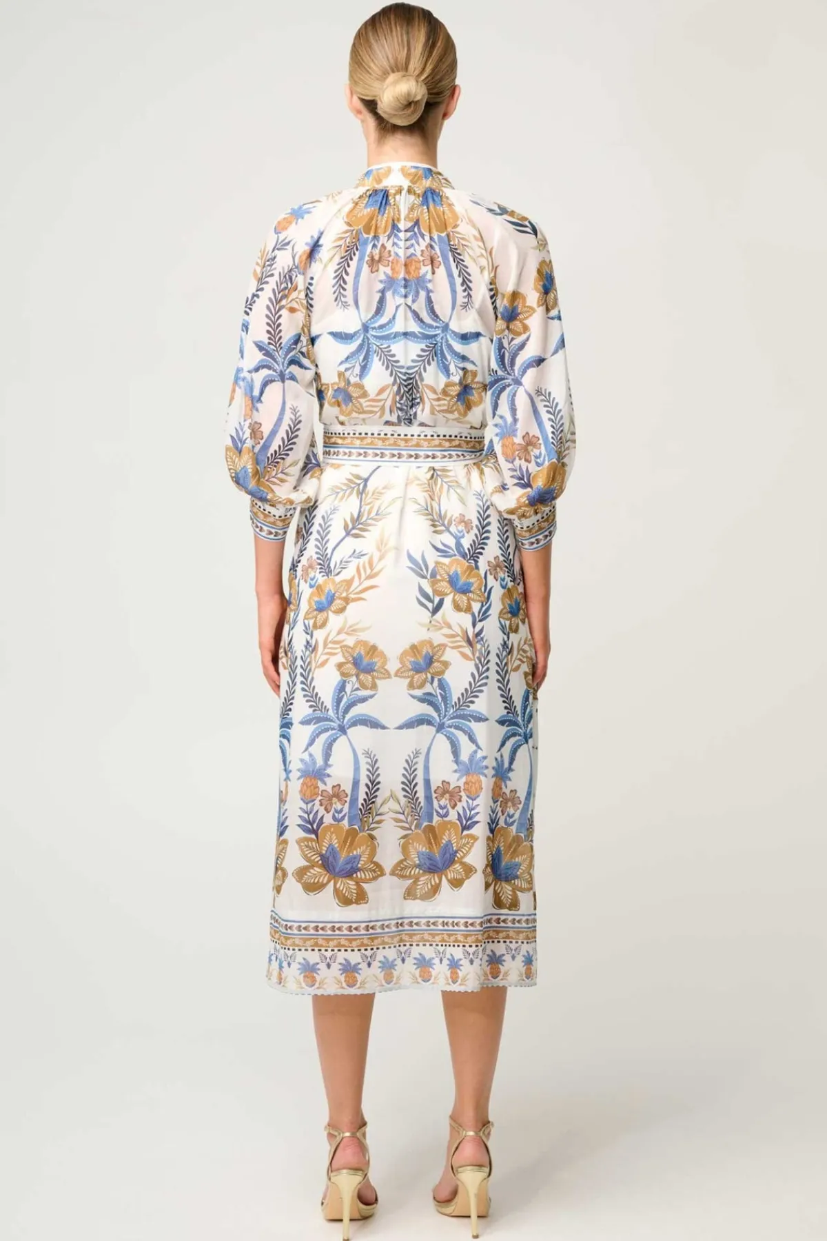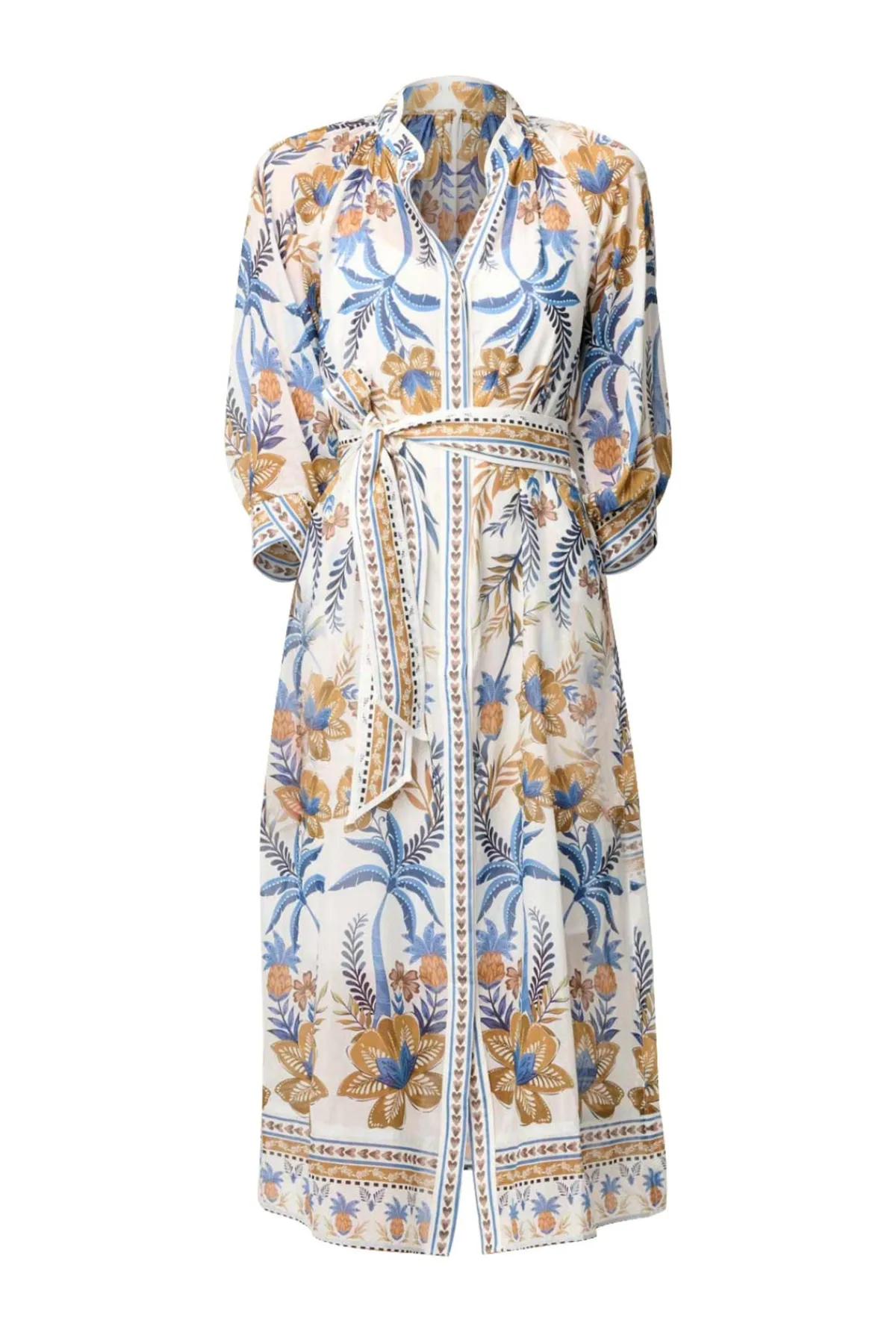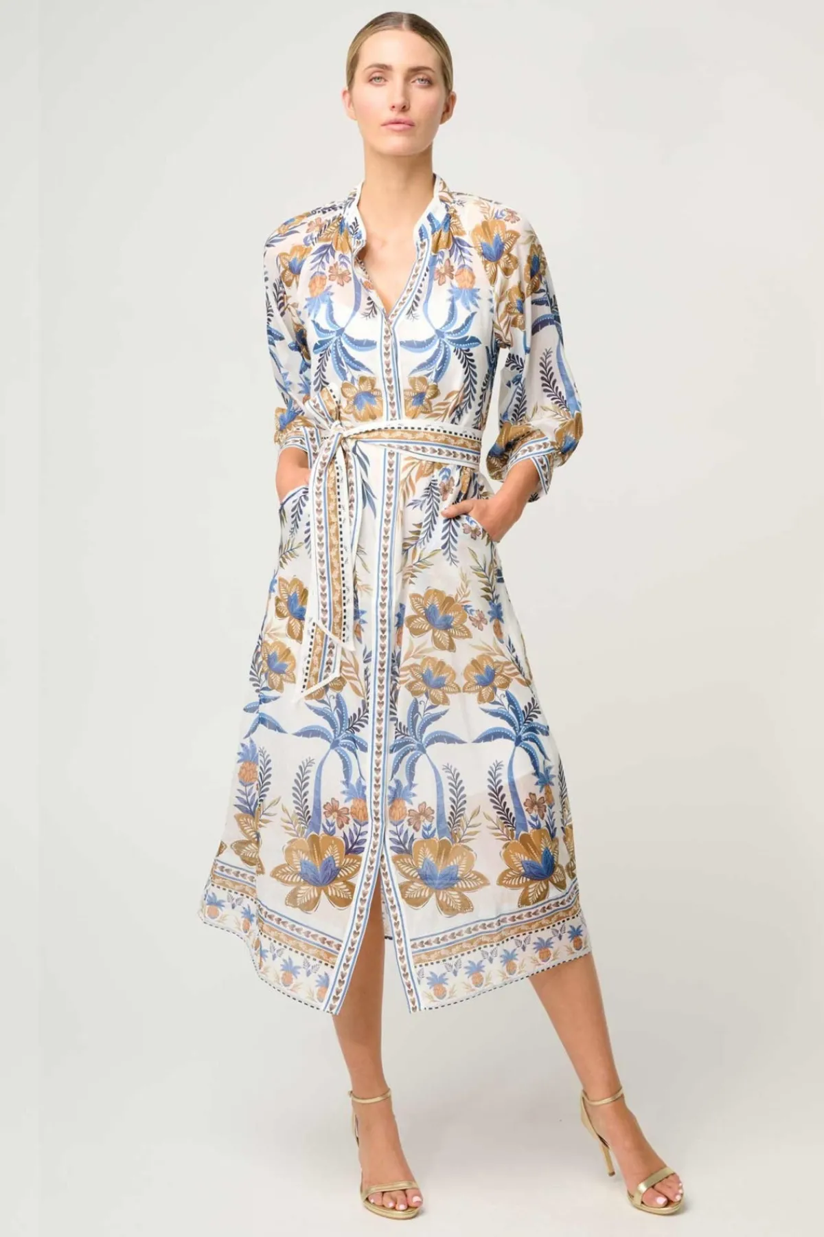 The Golden Medina print is a striking mix of golden tones and rich blue florals, inspired by artisanal patterns and exotic destinations. The design features a button-through front, allowing you to style it closed as a full-length dress or slightly open for a more relaxed, layered look. A removable self-tie belt cinches the waist, offering a customizable fit that flatters every figure. Finishing touches such as the contrast trim detailing and subtle blouson sleeves add depth and polish to this versatile wardrobe hero.