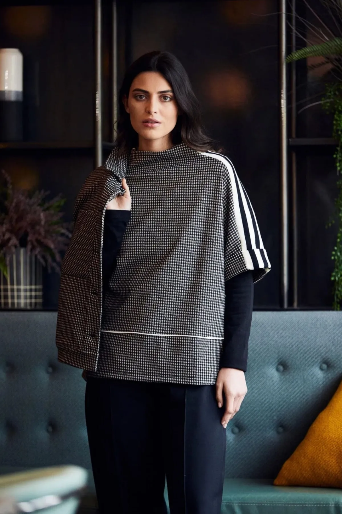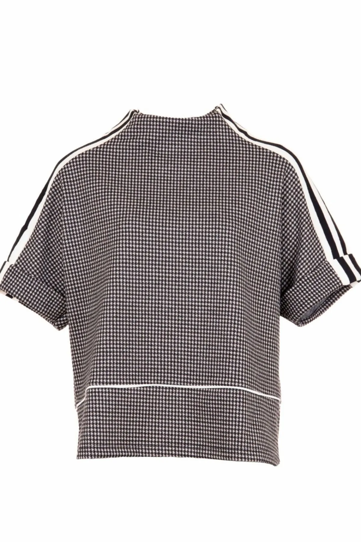PERUZZI houndstooth top with a high neckline and contrasting sleeve stripe detail.