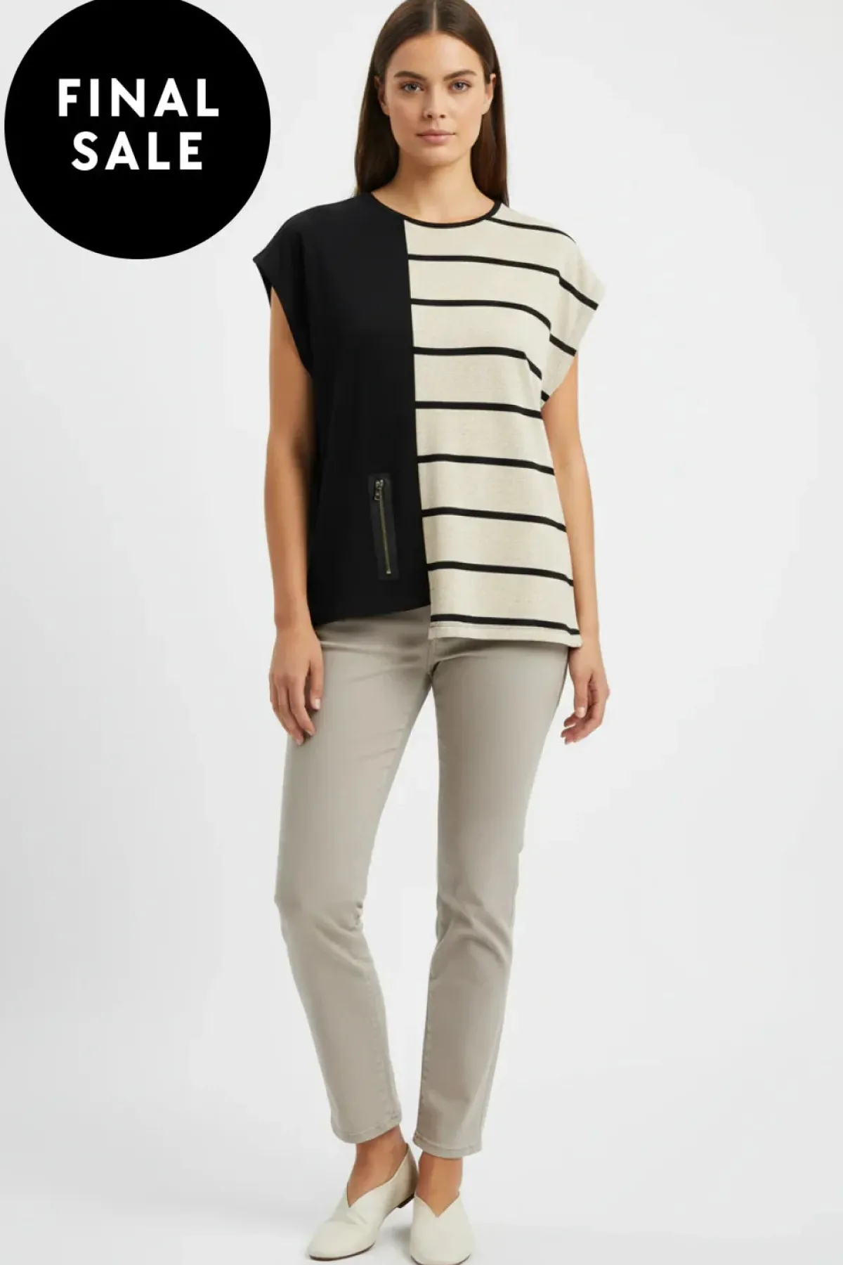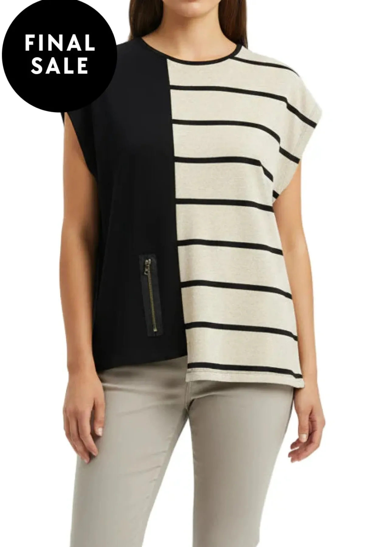 Indulge in luxury with the Stripe Sleeveless Top. This tunic top is perfect for cooler days, wear it over a black long sleeve top and pair it with black jeans for a sophisticated look. With its side zip pocket and cap sleeve, this top offers both style and functionality. The asymmetric stripe on the front adds a touch of artistry to this exclusive piece.