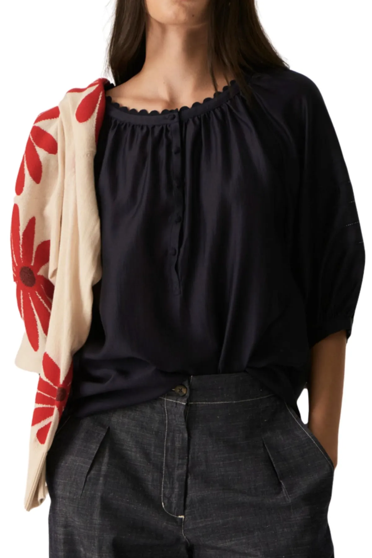 The Elea Top features femme detailing in a lightweight fabrication with a slight sheen.