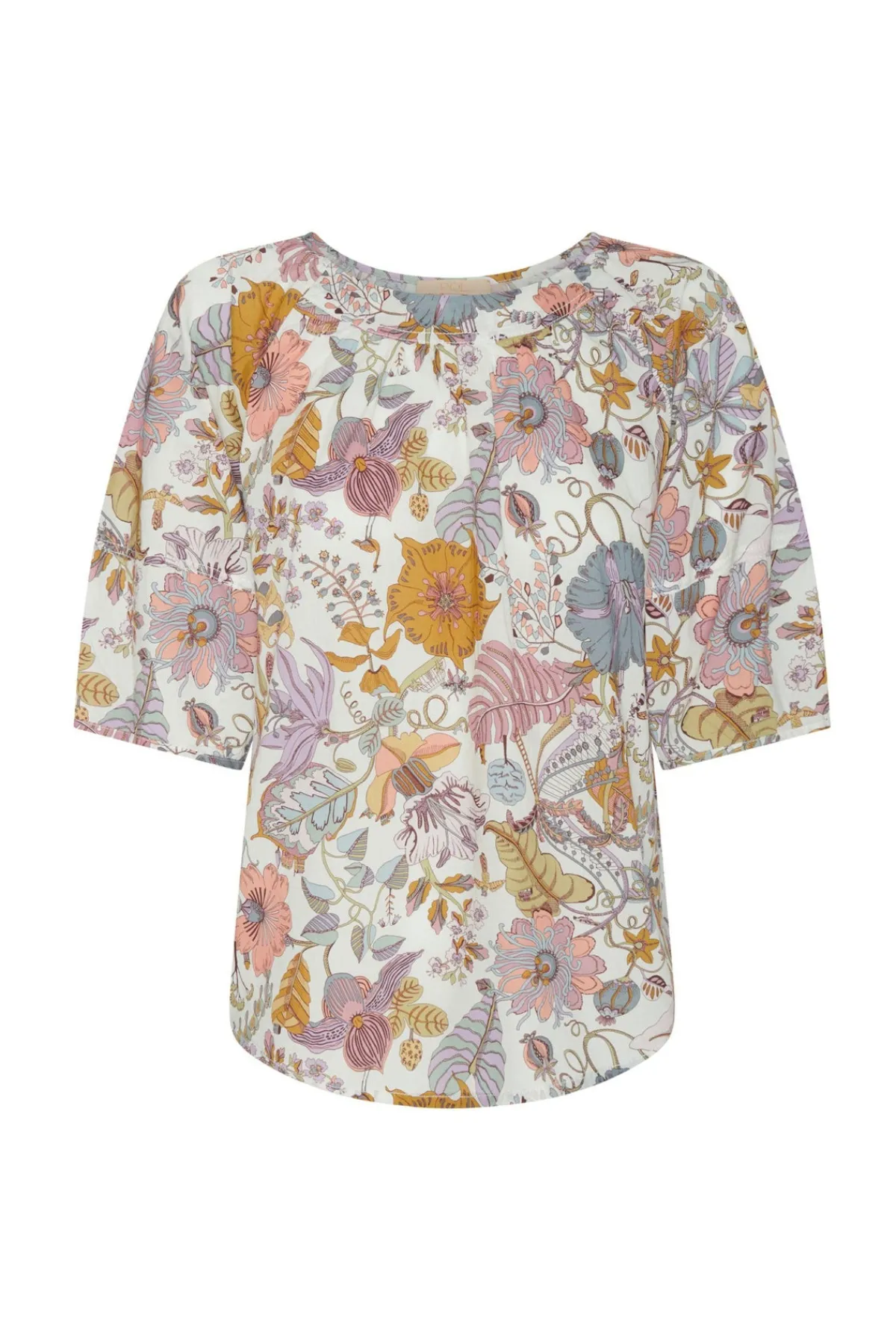 - Wide round neckline with topstitch detailing – flat at the front with gathering over the shoulders and back