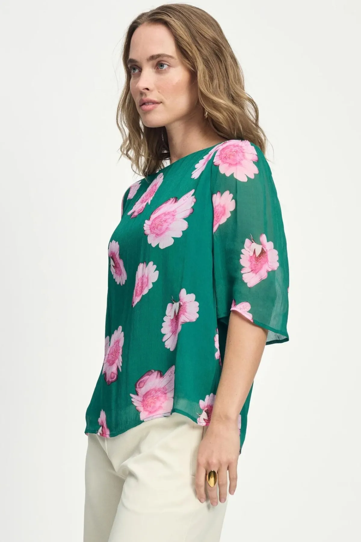 Indulge in the luxurious florals of this green blouse, a must-have in your wardrobe. Its chic design is elevated with butterfly sleeves and it’s crafted from 100% woven viscose in a delicate crinkle texture.