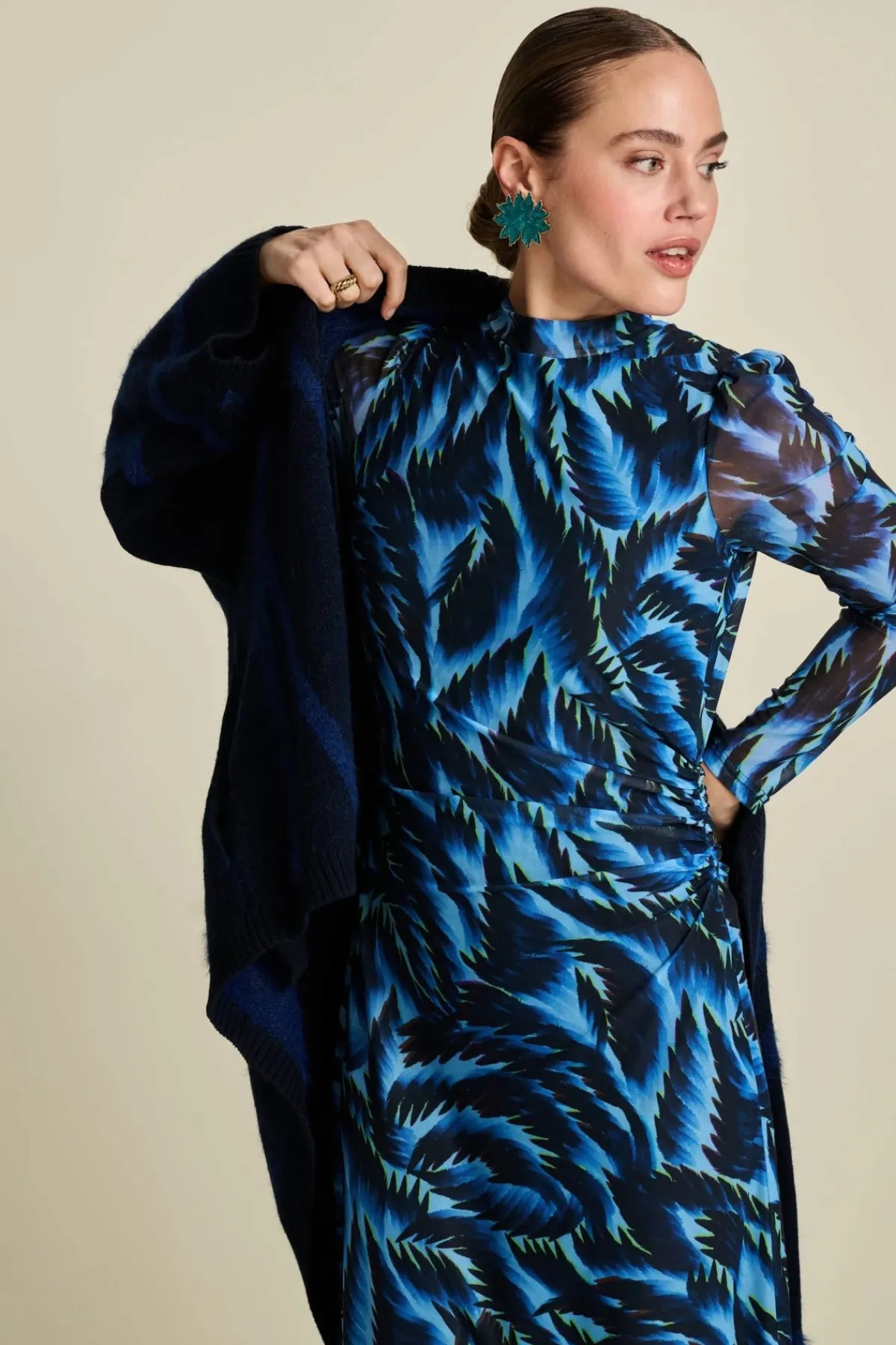 The blue midi dress features a unique handmade feather print. This dress is a real eye-catcher! The mesh fabric of the dress is made of recycled polyester, making this a more sustainable item.