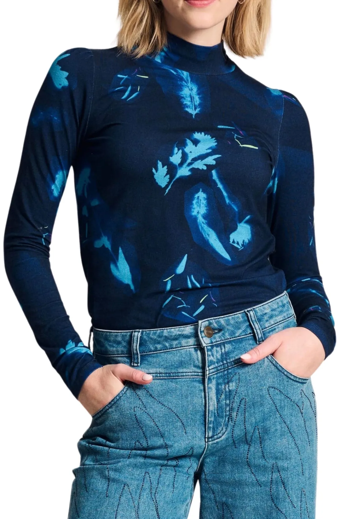 POM Tops|Winter Style-FLORAL TURTLE NECK TOP BLUE